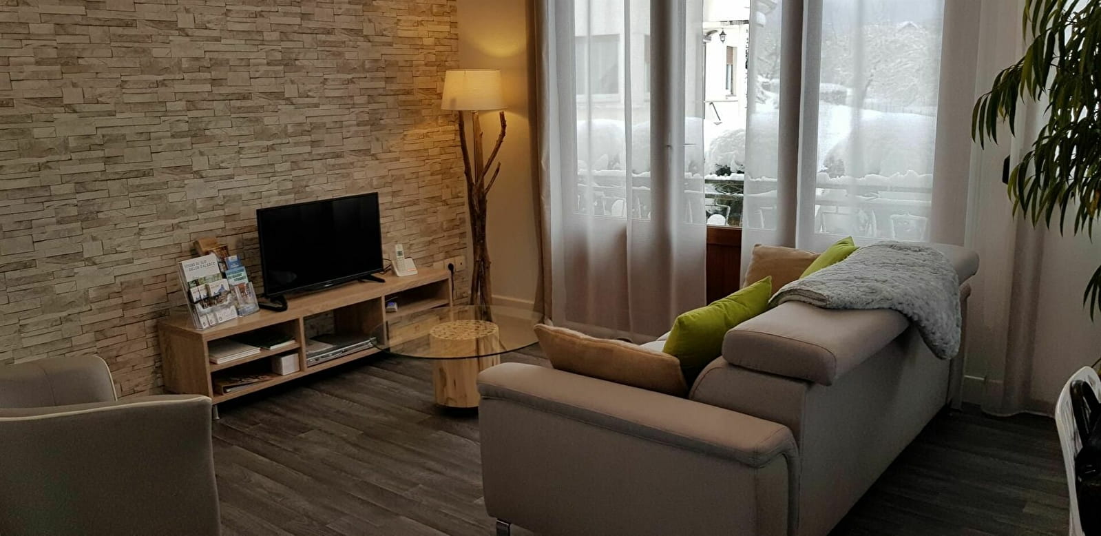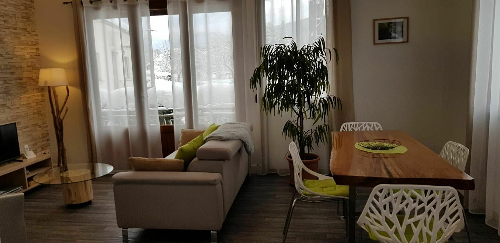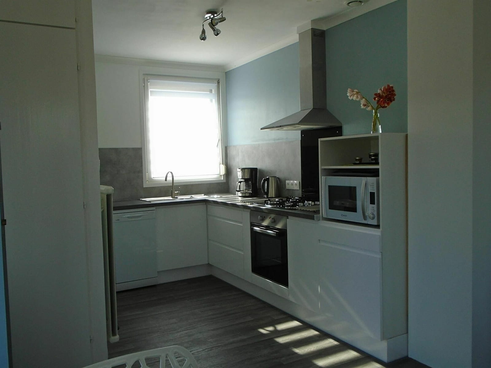 Maison individuelle pour 4 personnes, à l'étage. L'hébergement comprend une grande pièce de vie ouverte sur cuisine équipée, canapé fixe, écran plat, wifi.