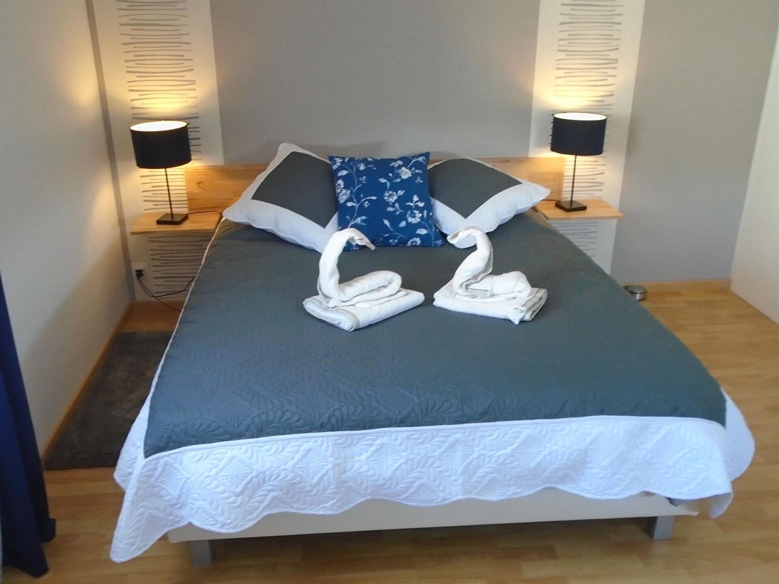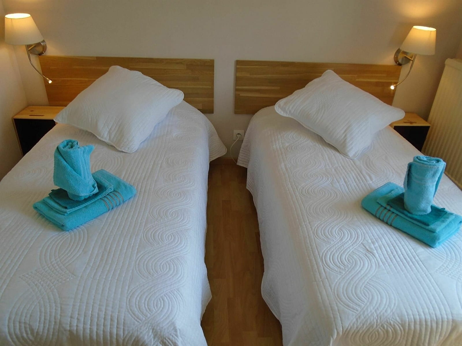 1 chambre avec 1 lit 2 personnes 160 cm x 200 cm et 1 chambre avec 2 lits 90cmx190cm (transformable en 180x190 pour un couple.)