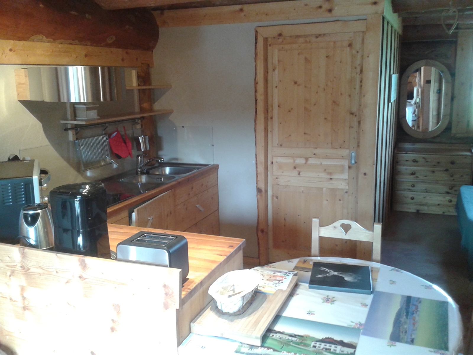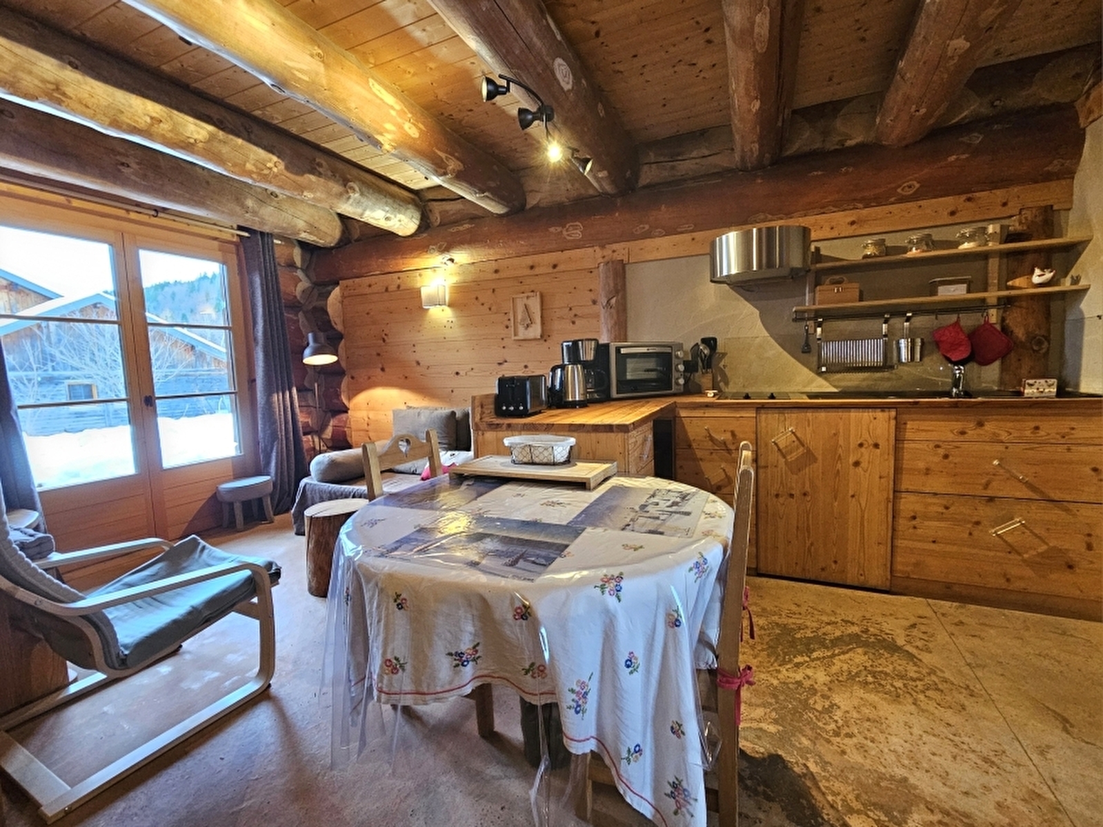 Situé dans un grand chalet, l'appartement de 39m² est composé d'une cuisine ouverte avec un canapé clic-clac, d'un coin nuit ouvert sur le séjour avec lit en 140cm et d'une salle d'eau avec WC.