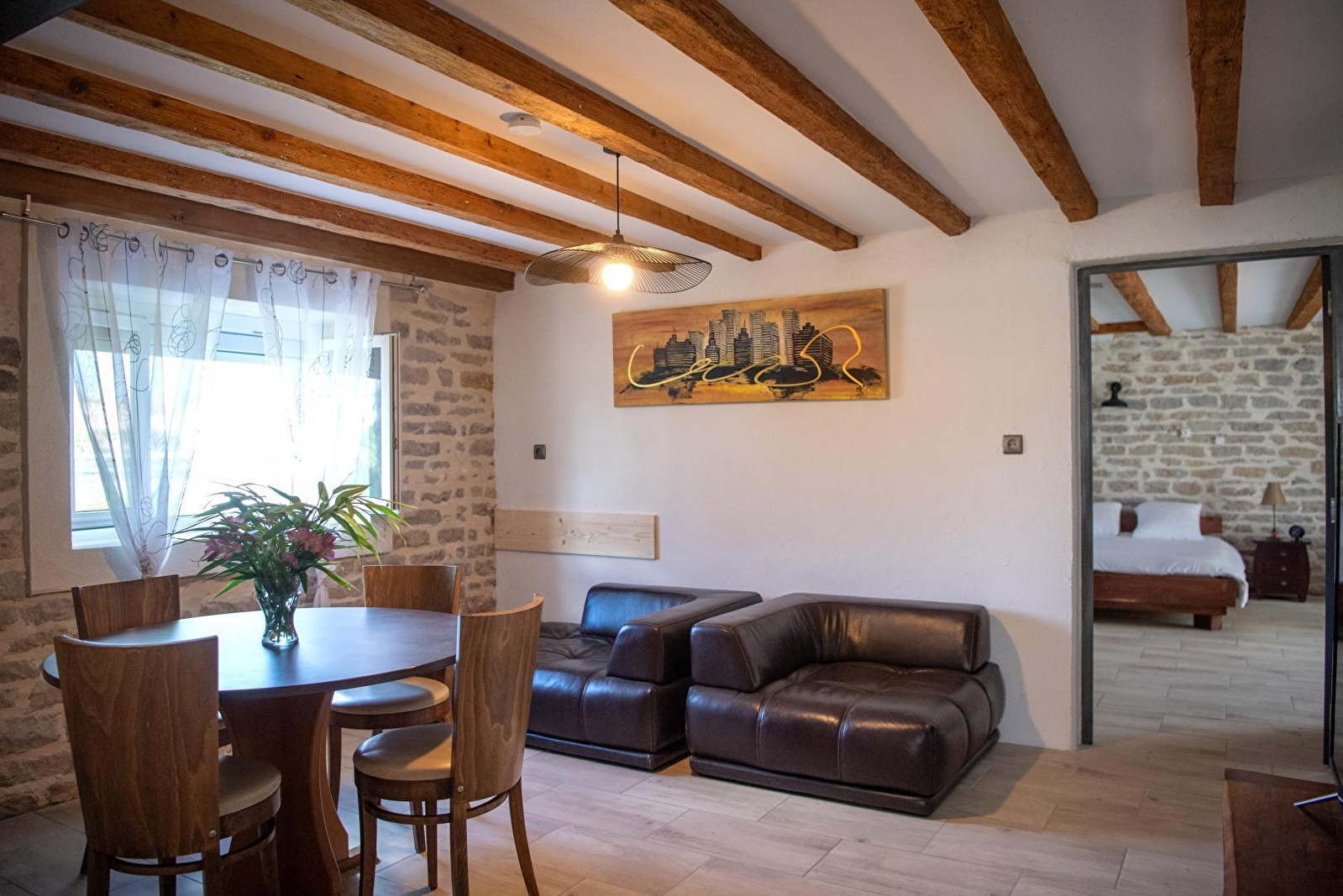 Composition : Propriété comprenant 4 gîtes et le bar à vin des propriétaires (ouvert de mai à août uniquement le WE). Maison comprenant 2 gîtes (indépendance totale). Wifi (fibre). Chauffage central gaz. Lave-linge dans buanderie commune (accès par extérieur). Plain-pied : séjour-cuisine-salon, 2 chambres (lit 2 p. 160x200cm / lit 2 p. 140x190cm), salle d'eau (douche), Wc indépendant. Terrasse + parking privés. Terrain 1.4 ha (cour + jardin avec espace terrasse "barbecue" / brasero-plancha-four à pizza) + local vélos en commun. Toutes commodités à 1 km. Supermarché 1.5 km.
