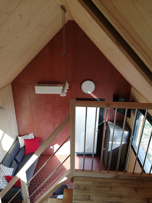 Lodge entièrement rénové par un artisan spécialisé dans la maison en ossature bois, avec grandes fenêtres et velux panoramiques, tout en bois local. Ce superbe Lodge offre une prestation intérieur tout confort : 1 grande chambre avec dressing avec lit de 160*200, 1 mezzanine, équipée de 2 petits lits 90*200, spacieuse vous fait profiter de tout le paysage, une salle d’eau avec douche, pièce de vie et sa cuisine toute équipée ouverte : Four, micro-onde, robot de cuisine, réfrigérateur congélateur, lave-vaisselle. La pièce de vie est dotée d’une télévision à écran plat avec Amazon prime vidéo. La maison a la WIFI. Le mobilier est neuf et sa literie de qualité.