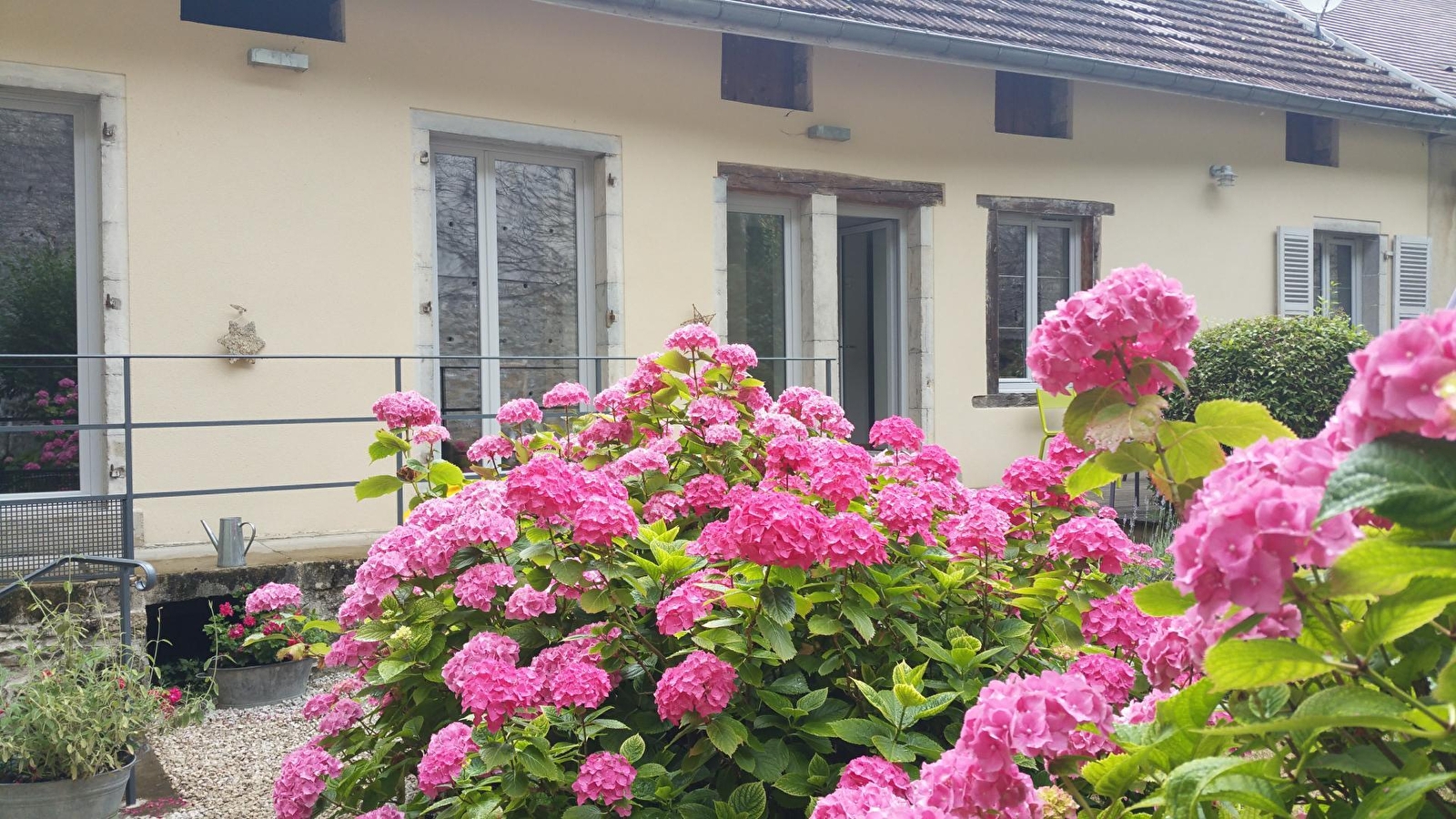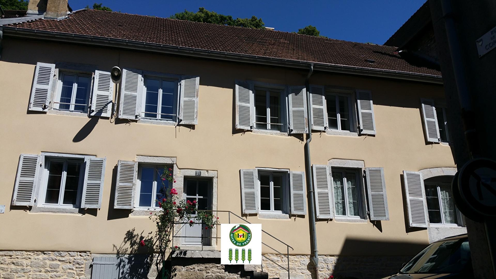 En plein coeur de la ville de Poligny, Capitale du Comté, maison mitoyenne entièrement rénovée avec goût et raffinement. Maison de plain pied (quelques marches pour accéder au gîte) composée d'une vaste cuisine ouverte sur la salle à manger, cellier, salon indépendant avec TV et lecteur dvd, Ch1 : 1lit 2pl(160x200), Ch2 : 2lits 1pl(90x200) toutes 2 disposent d'une salle d'eau commune avec douche et WC, Ch3 : 1lit 2pl(160x200), Ch4 : 2lits 1pl(90x190), les 2 chbres disposent aussi d'une salle de bain commune avec baignoire et WC. Cour intérieure avec jardin, terrasse, salon de jardin et barbecue. Lits faits à l'arrivée.