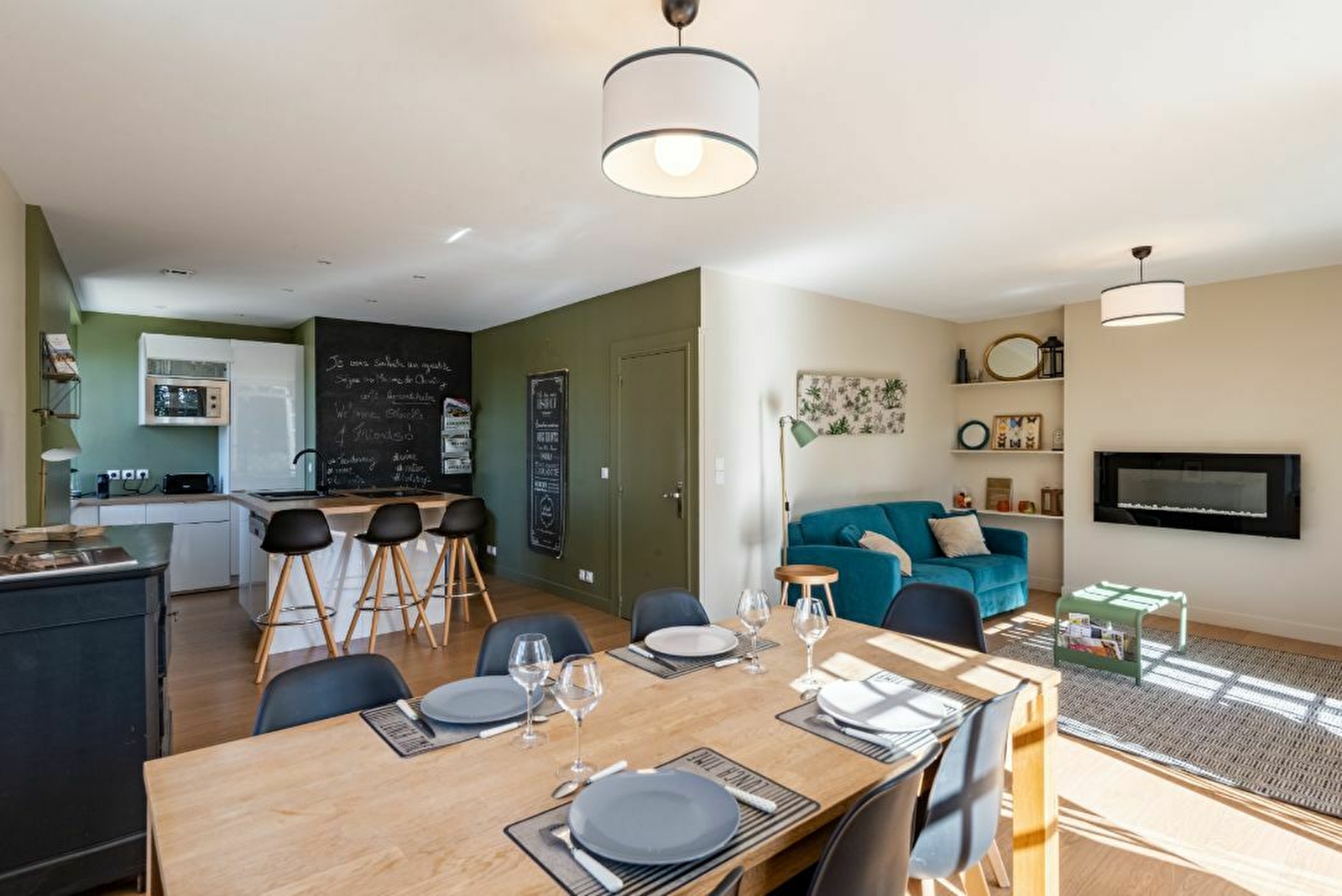 3 chambres, 3 salles de bains, 1 cuisine équipée, 1 salon/salle à manger, 1 sauna, 1 cave, 1 garage, parkings extérieurs gratuits, free wifi (fibre), free chargeur électrique, draps, linges et produits de toilette fournis, climatisation.
