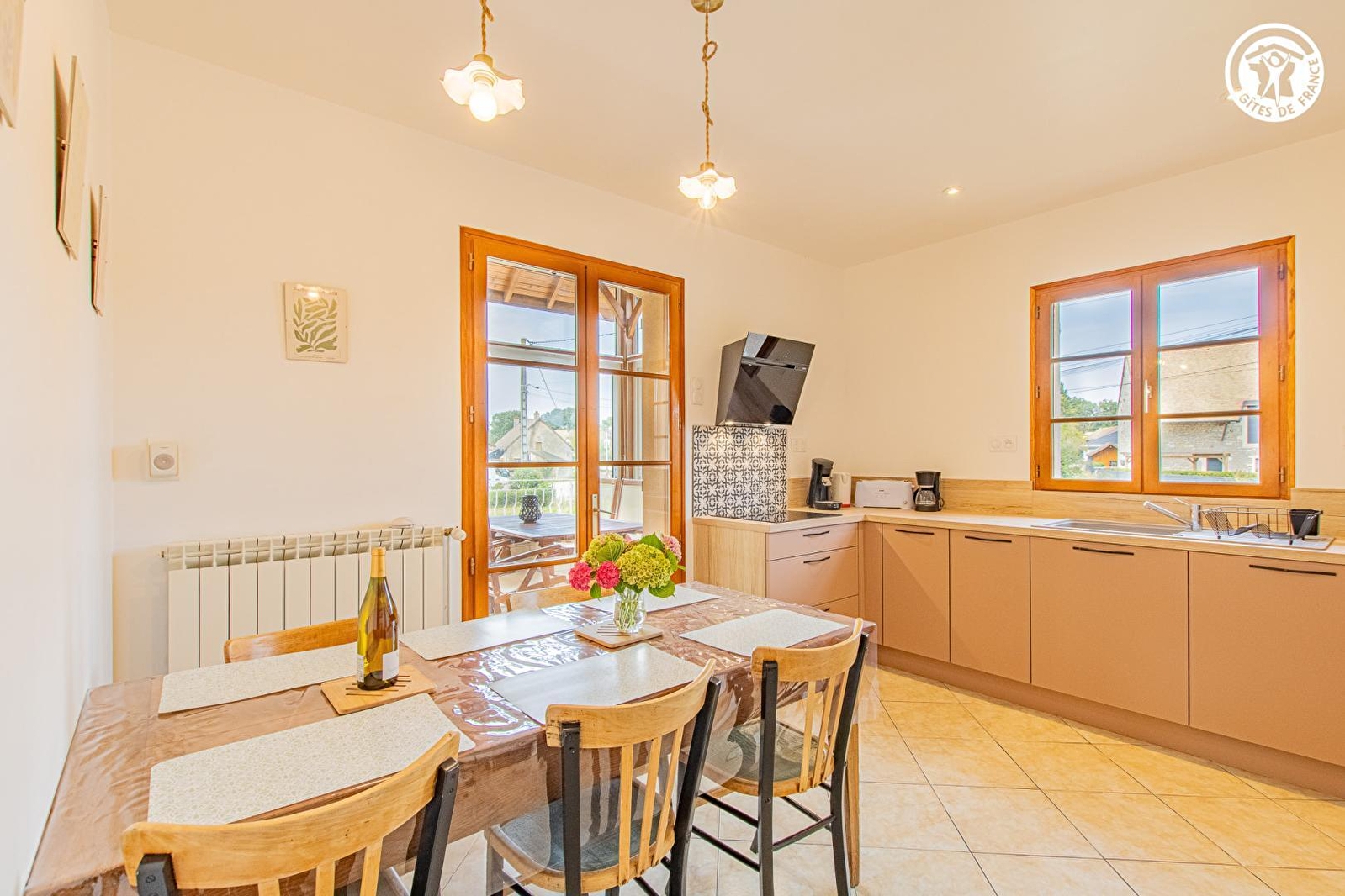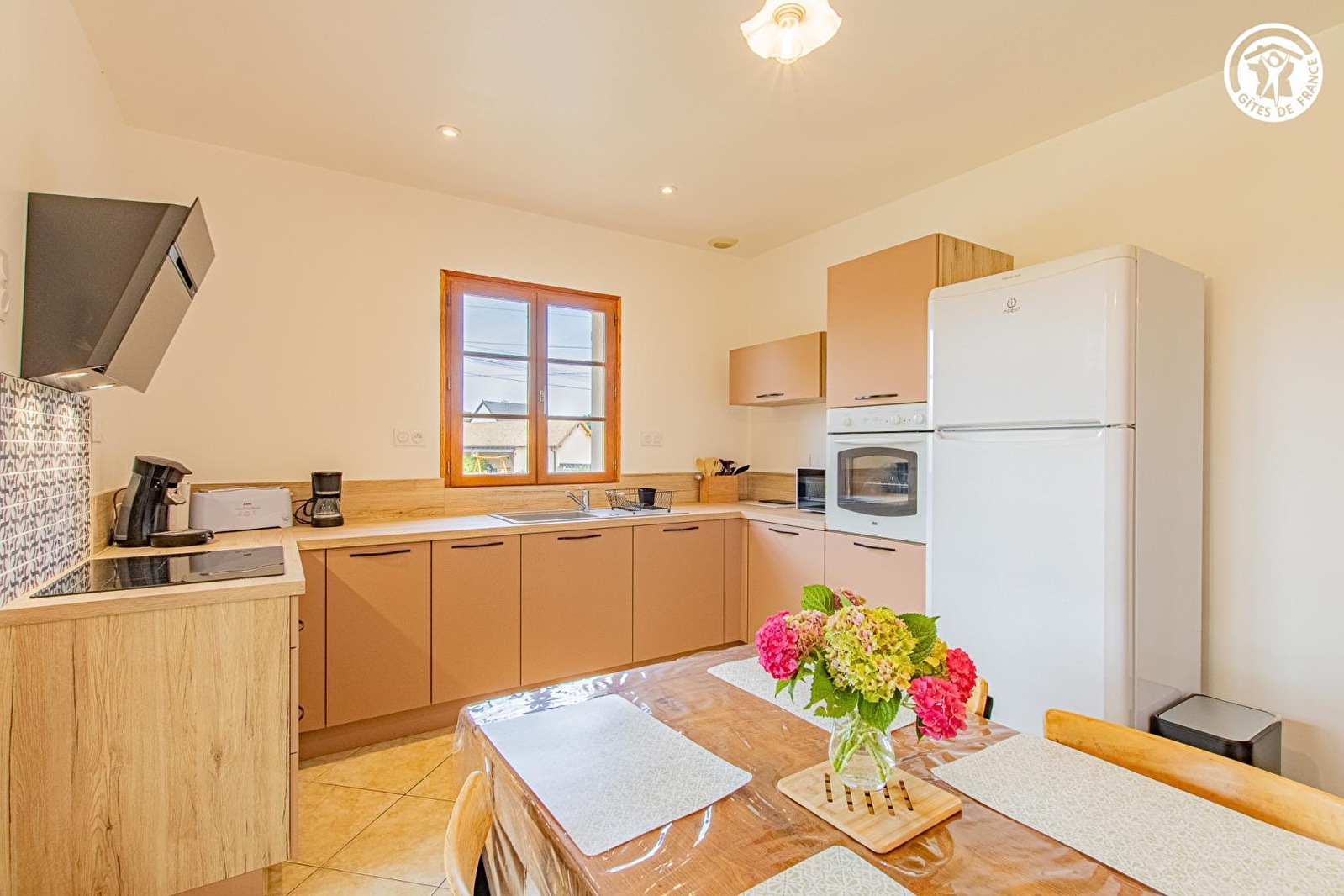 Composition : Maison individuelle. Wifi (fibre). Chauffage central fioul. Rdc surélevé (accès de "plain-pied" par une rampe extérieure) : Cuisine-séjour, salon TV, 3 chambres (2 lits 1 p. 90x200cm / lit 2 p. 140x190cm / 2 lits 1 p. 90x200cm), salle de bain (baignoire), douche, Wc indépendant, buanderie. Jardin (800m²) + terrasse abritée (sous véranda de 16m² non chauffée l'hiver) + balcon + local vélos + parking privatifs. Commodités 3.5 km. Supermarchés 3 km.