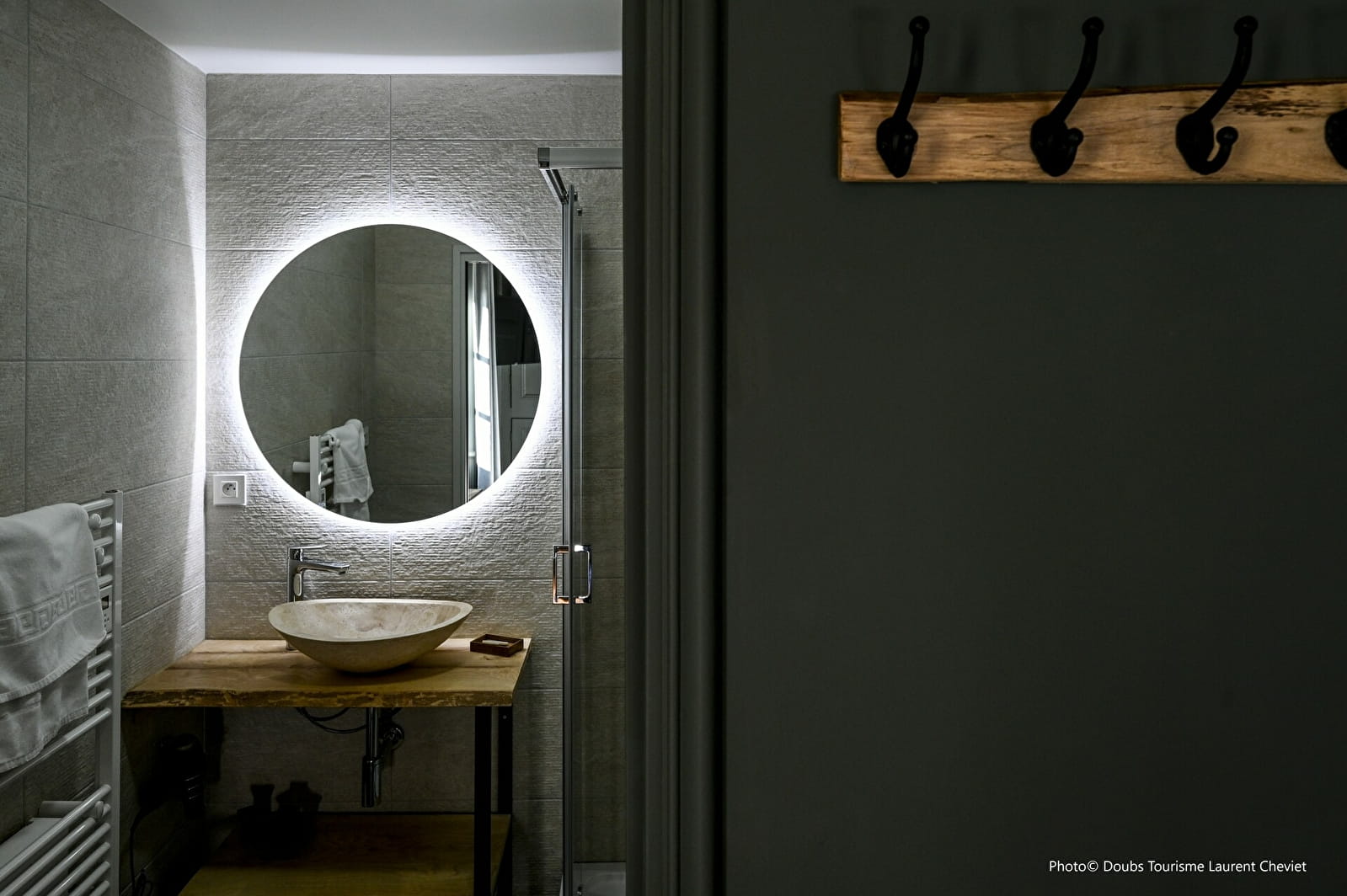 - La chambre avec salle de bains et wc privatifs, lits faits, linge de toilette, produits de toilette en distributeur - TV et accès WiFi