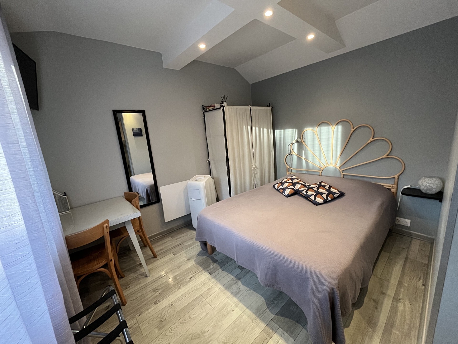 Une chambre avec un vrai lit double (140x190), armoire/penderie, télévision, table et chaises, climatiseur mobile, ventilateur en saison.