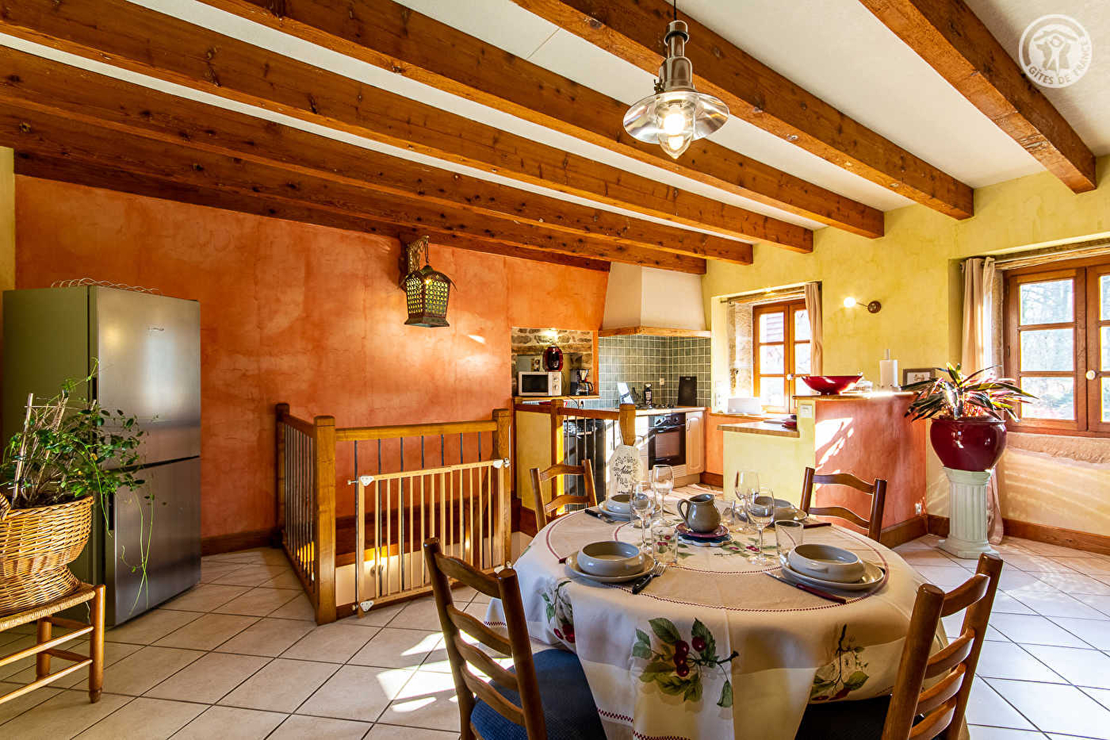 Composition : Maison comprenant 2 gîtes et le logement du propriétaire (indépendance totale). Wifi (fibre). Chauffage PAC. Rdc : hall-buanderie, salle d'eau (douche), wc indépendant. 1er étage : séjour-cuisine-salon (pièce de vie ouverte avec espaces délimités / canapé convertible 2 p. 140x190cm en appoint). 2ème étage : Espace couchage composé de 2 chambres en enfilade dont grande "mezzanine" (lit 1 p. 90x190cm + lit 2 p. 160x200cm / lit 2 p. 160x200cm), Wc indépendant. Terrain commun (jardin et cour). Terrasse + balconnet + parking privés. Commerces & services 6 km. Gare Creusot TGV 19 km.