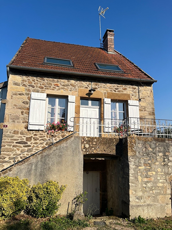 Au calme d'un hameau, maison individuelle pour 2 à 3 personnes. Entrée dans la maison par un escalier en pierre extérieur, balcon pour prendre vos repas avec plancha électrique à disposition. A l'intérieur pièce à vivre avec canapé clic-clac (couchage d'appoint pour la 3ème personne à 15€/nuit), télé, poêle à granulés; cuisine séparée équipée; une salle d'eau comprenant une douche, wc, sèche serviette chauffant). A l'étage très grande chambre avec 1 lit 160x200, et un bureau.