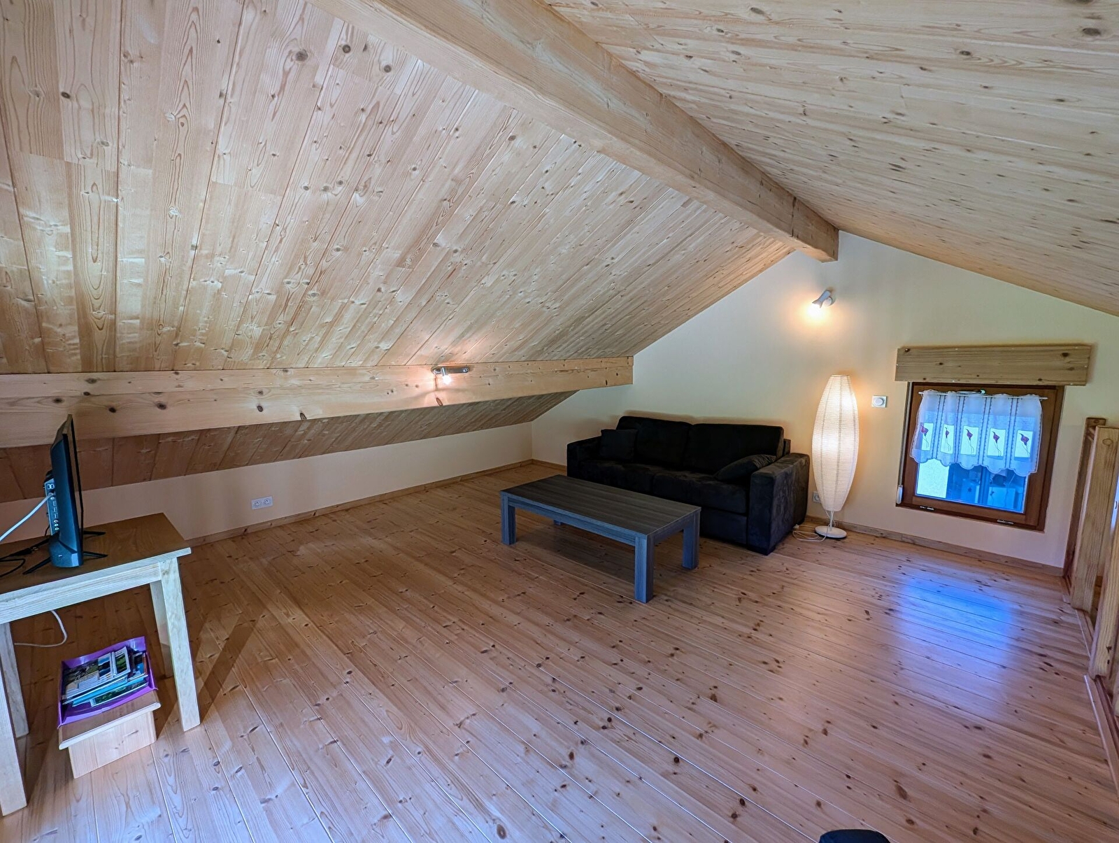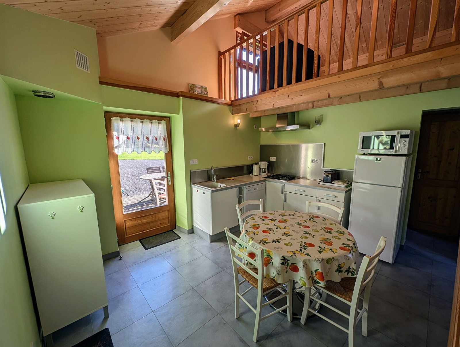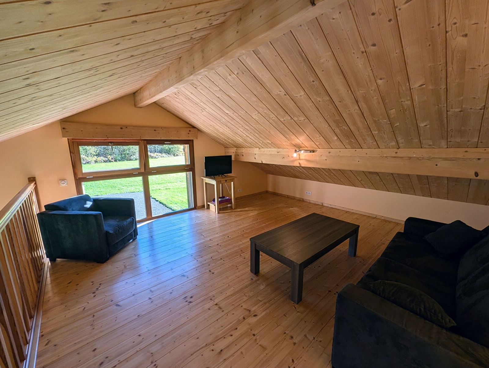 Au rez-de-chaussée : cuisine équipée. Une chambre (1 lit 140/190 cm). Salle d'eau, WC suspendu. À l'étage : salon lumineux en mezzanine (possibilité lit 2 personnes : canapé convertible de grand confort avec sommier à latte 140/190 cm). TV écran plat/TNT. Magnifique vue sur la nature, où biches et chevreuils se laissent parfois contempler. Parking. Local fermé pour les vélos avec tuyau d'arrosage. Terrasse en bois. Jardin en pelouse. Chauffage électrique. Charges comprises.