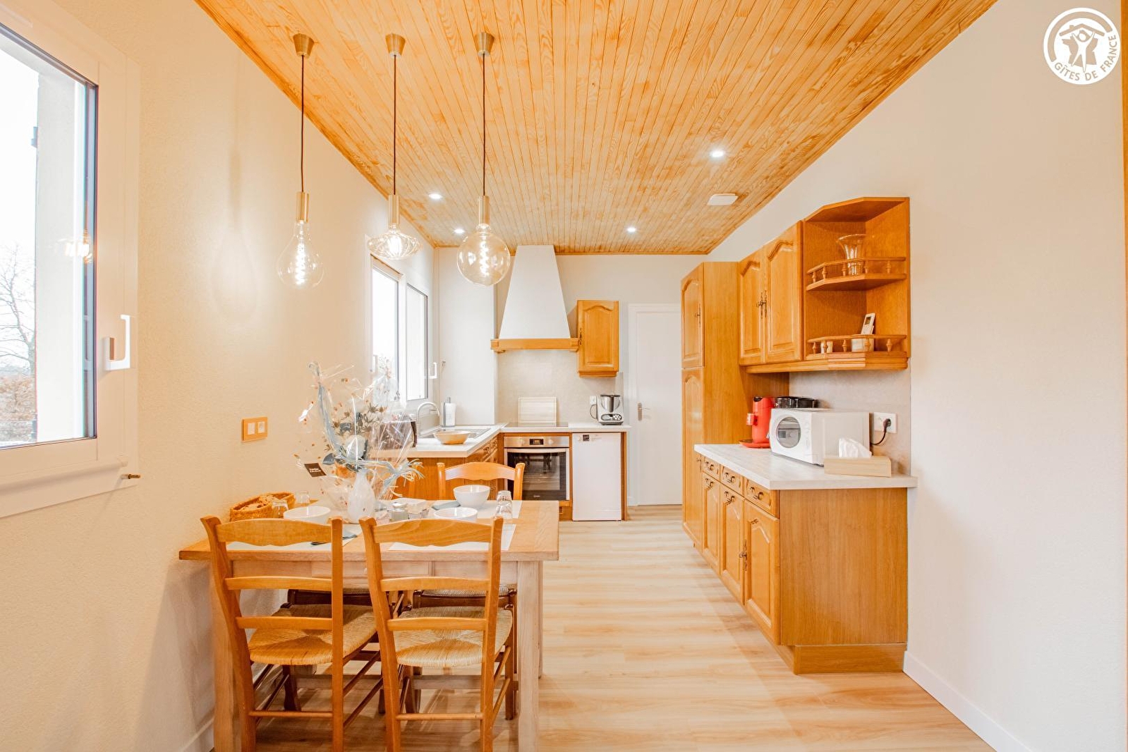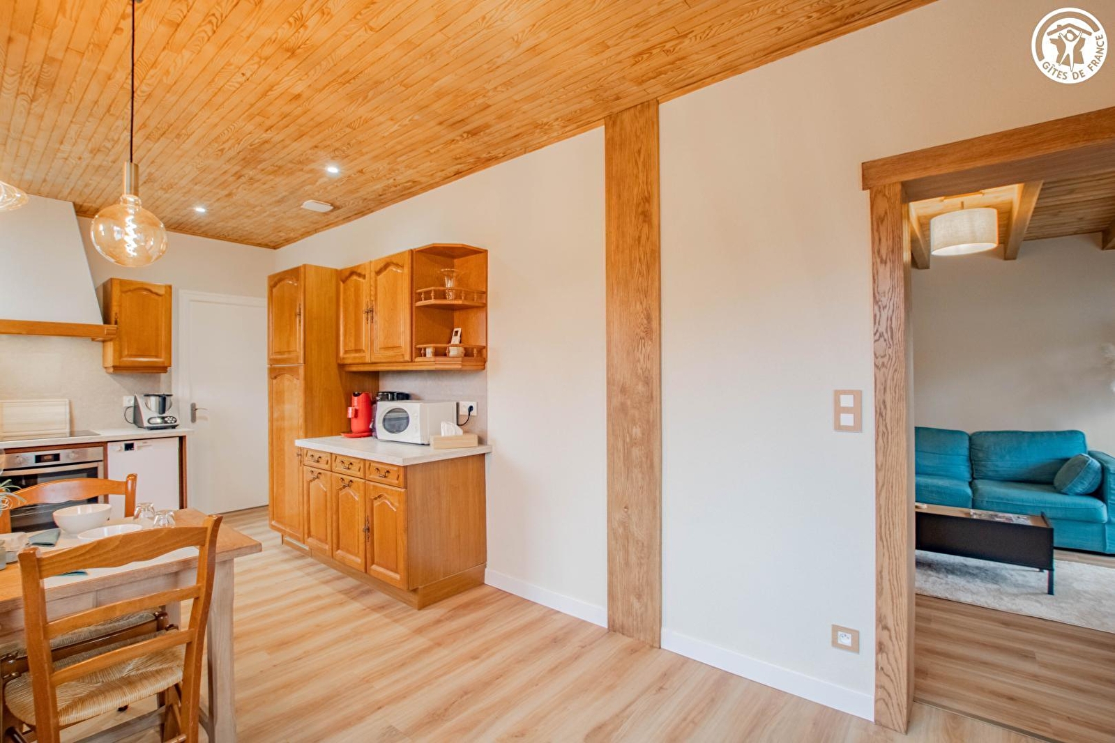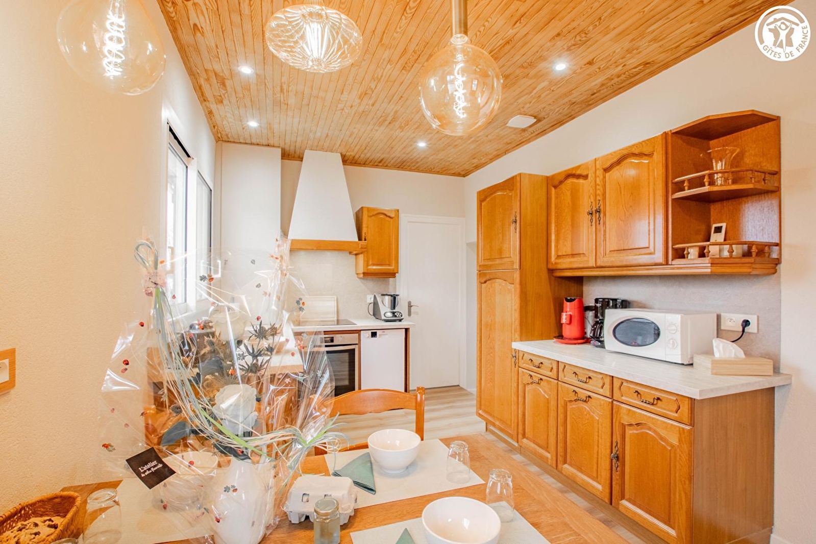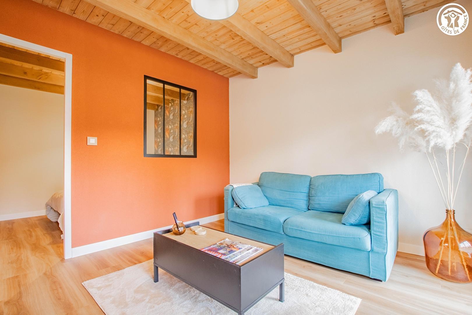 Composition : Gîte de plain-pied mitoyen à l'habitation des propriétaires (totale indépendance). Wifi. Chauffage électrique. Climatisation. Rdc (avec mini demi-niveau intérieur de 2 marches pour accéder à 1 chambre) : séjour-cuisine, salon TV, 2 chambres (lit 2 p.140x190cm / 2 lits 1 p. 90x190cm) dont 1 donnant en "second jour" sur le salon (sans ouverture directe sur l'extérieur), salle d'eau (douche/Wc). Terrasse + local vélos + parking privés. Petite cour. Commerces et supermarché à 1.5 km.