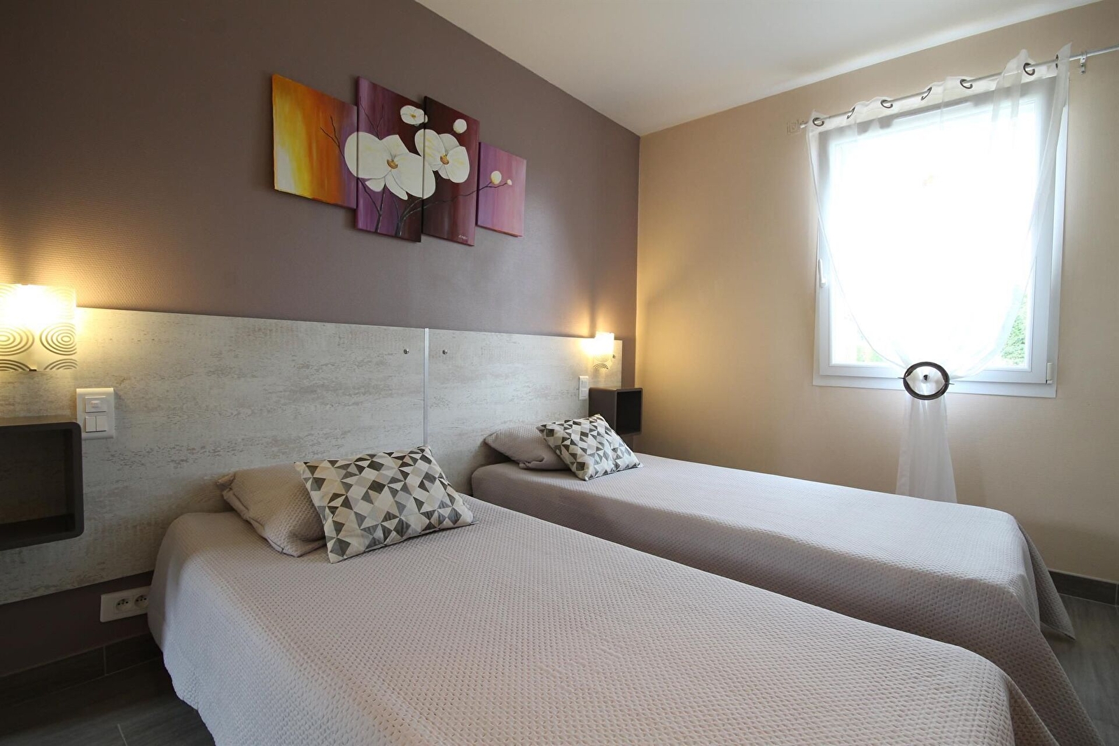Entrée. Cuisine ouverte sur vaste salle à manger/salon avec cheminée, et accès direct sur terrasse en bois. 2 chambres (2 lits 90x200 jumelables et 1 lit 160x200) dont une communicante avec la salle d'eau/WC (douche à l'italienne). WC. Buanderie. Le gîte est équipé d'un lit parapluie, d'une chaise haute, un tapis à langer, une baignoire.