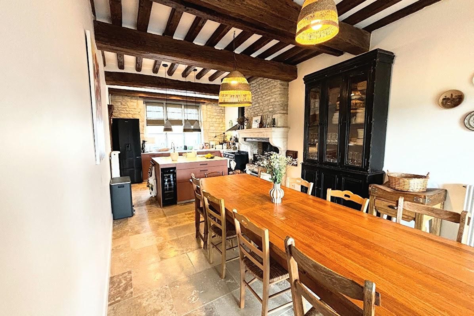 Au RDC, l’entrée du gîte, spacieuse, dessert une grande cuisine équipée (plan de travail, piano de cuisson, cave à vin,…) un salon très lumineux avec TV écran plat et enceinte connectée. Belle cheminée (bois fourni) une salle d’eau avec douche à l’italienne, un WC indépendant et un espace buanderie.