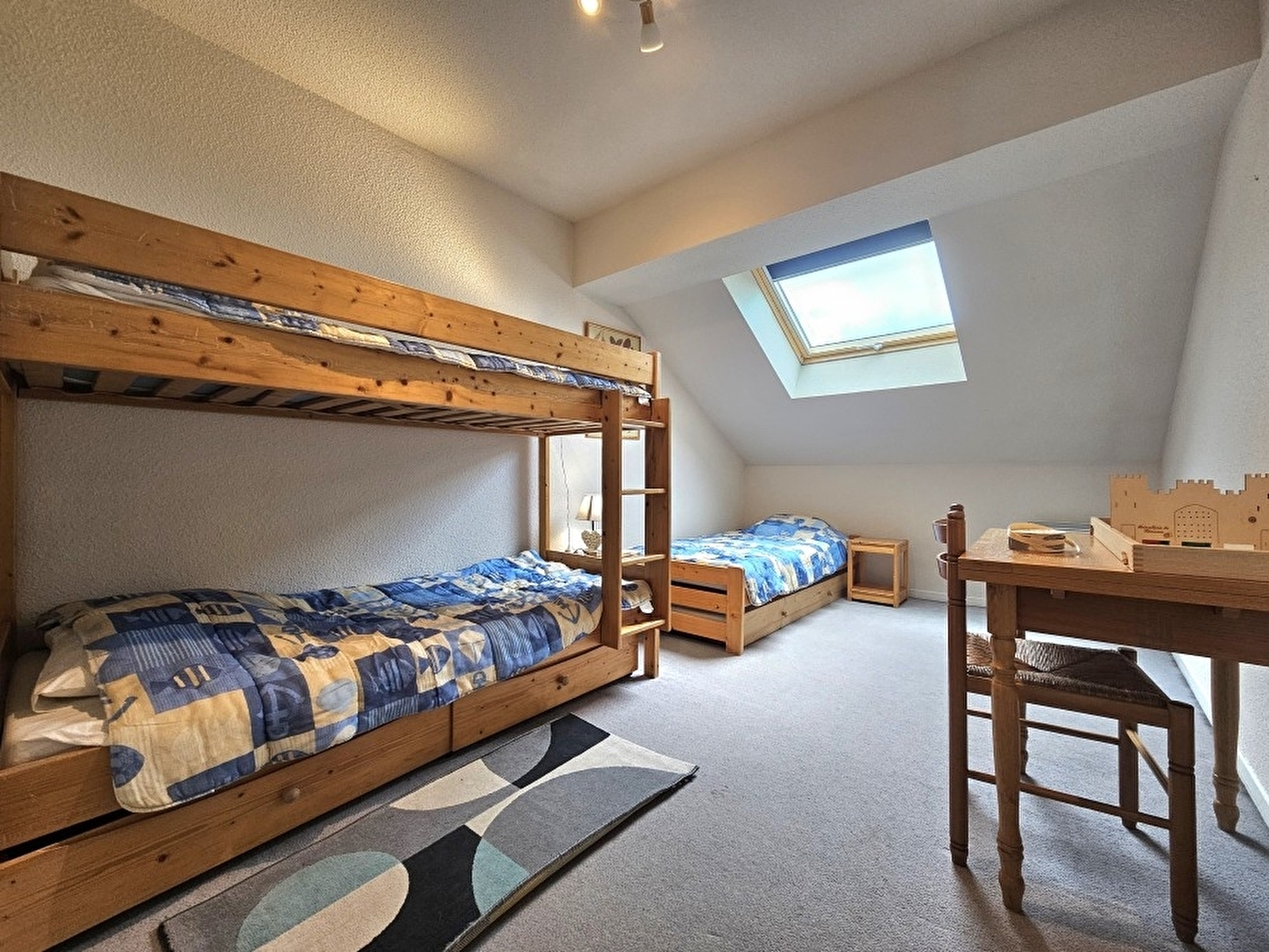 A l’étage l’espace nuit est composé d’une première chambre avec 1 lit tiroir en 2x90cm et 1 lit superposés 90cm et une seconde chambre avec un lit en 140.