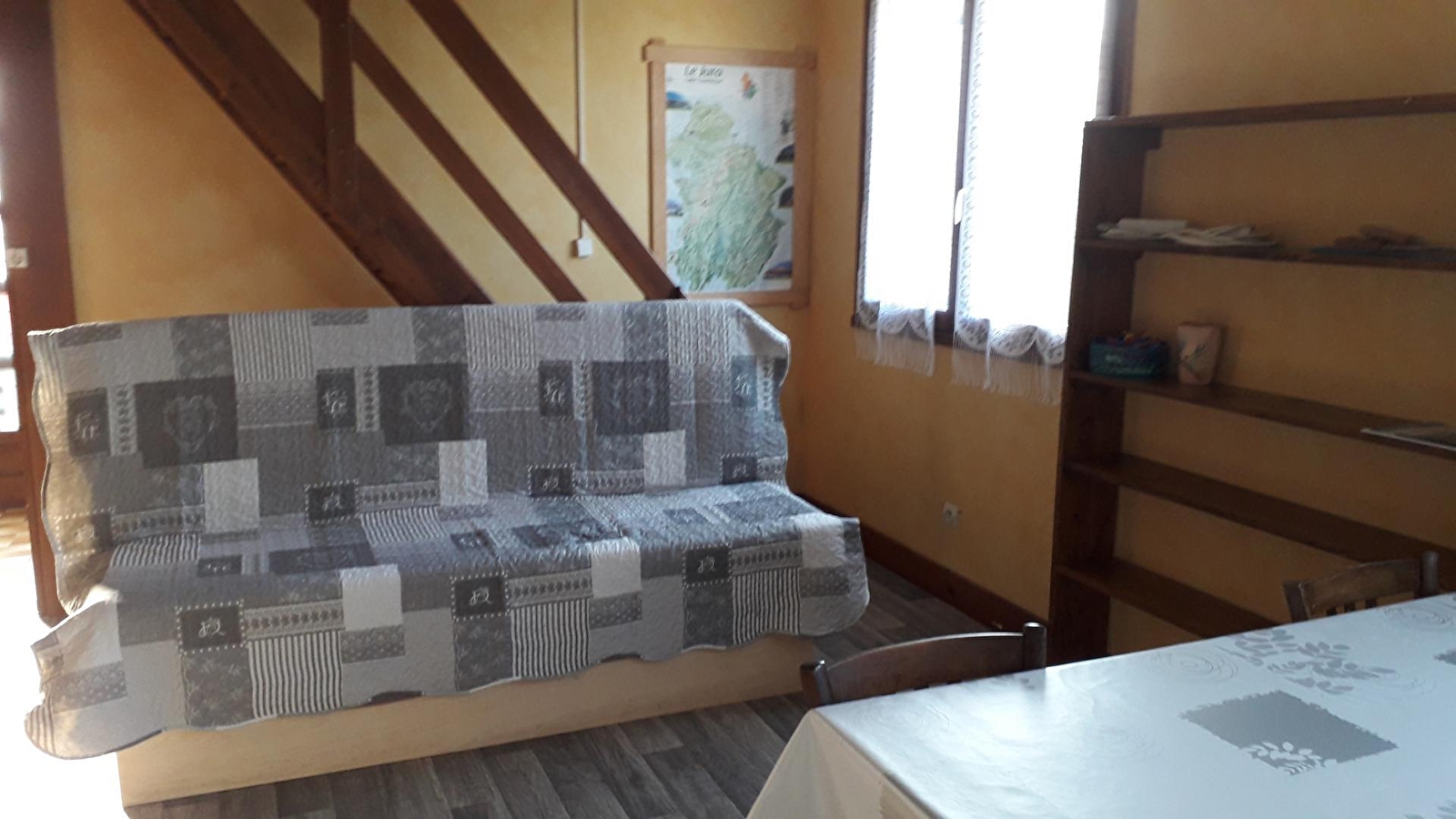 Dans un village tranquille dominant Clairvaux-les-Lacs, entre lacs et forêts, maison mitoyenne, au RDC: séjour-salon, poêle à bois, coin-cuisine, ch1: 1 lit 2 pl, ch2: 1 lit 2 pl, salle de bains. A l'étage: ch3: 1 lit 1 pl, 1 lit 2 pl, terrain attenant clos, cour, terrasse ombragée, salon de jardin, barbecue. Parking privé. Chauffage électrique et bois. Toutes charges comprises. Aire de jeux pour enfants et terrain de pétanque à proximité.