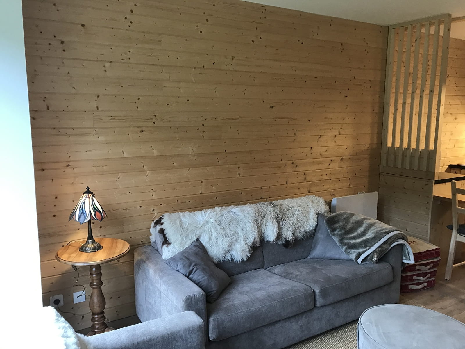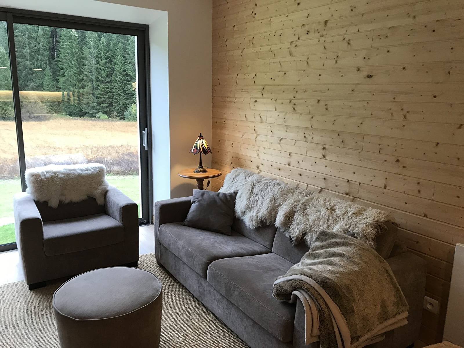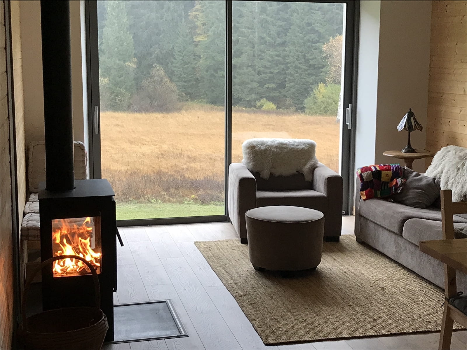 Pièce de vie : canapé, fauteuil, poêle à bois, banc, tables de salon.