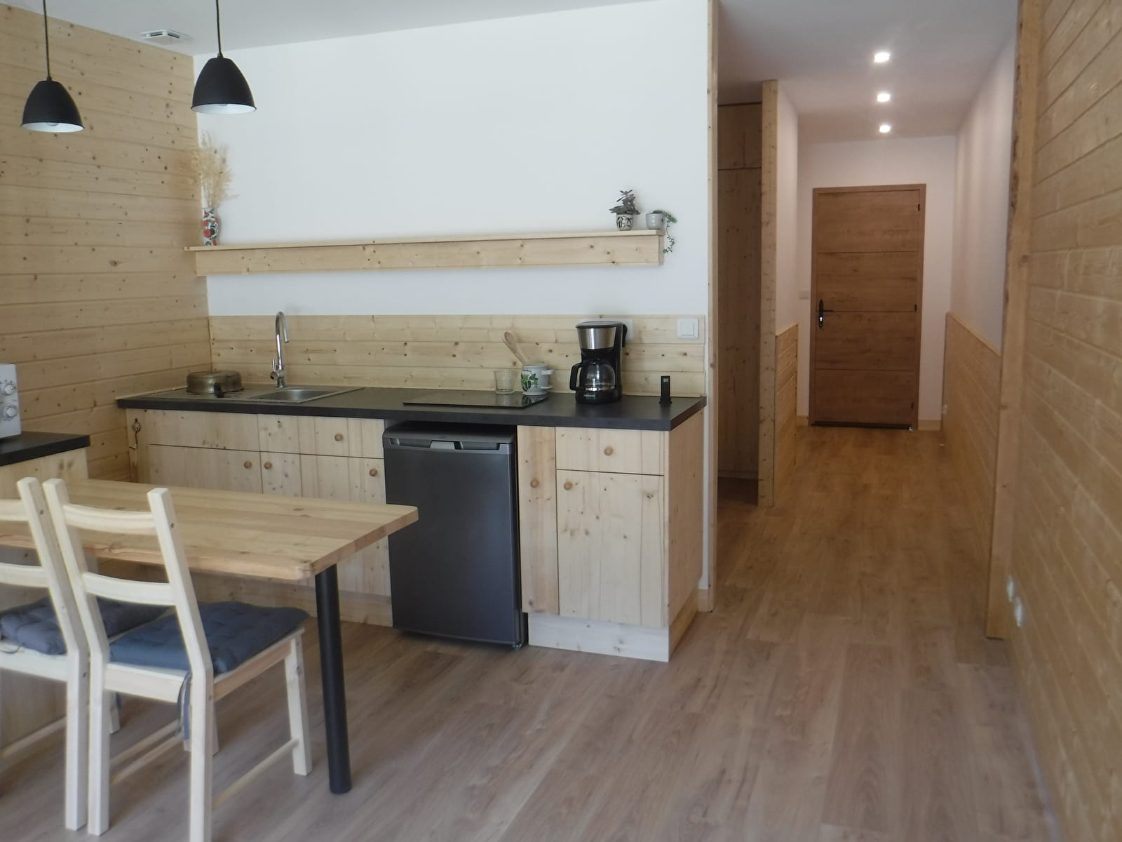 Cuisine intégrée : plaque de cuisson induction, réfrigérateur, four micro-onde, cafetière filtre, bouilloire, vaisselle et ustensiles de cuisine.