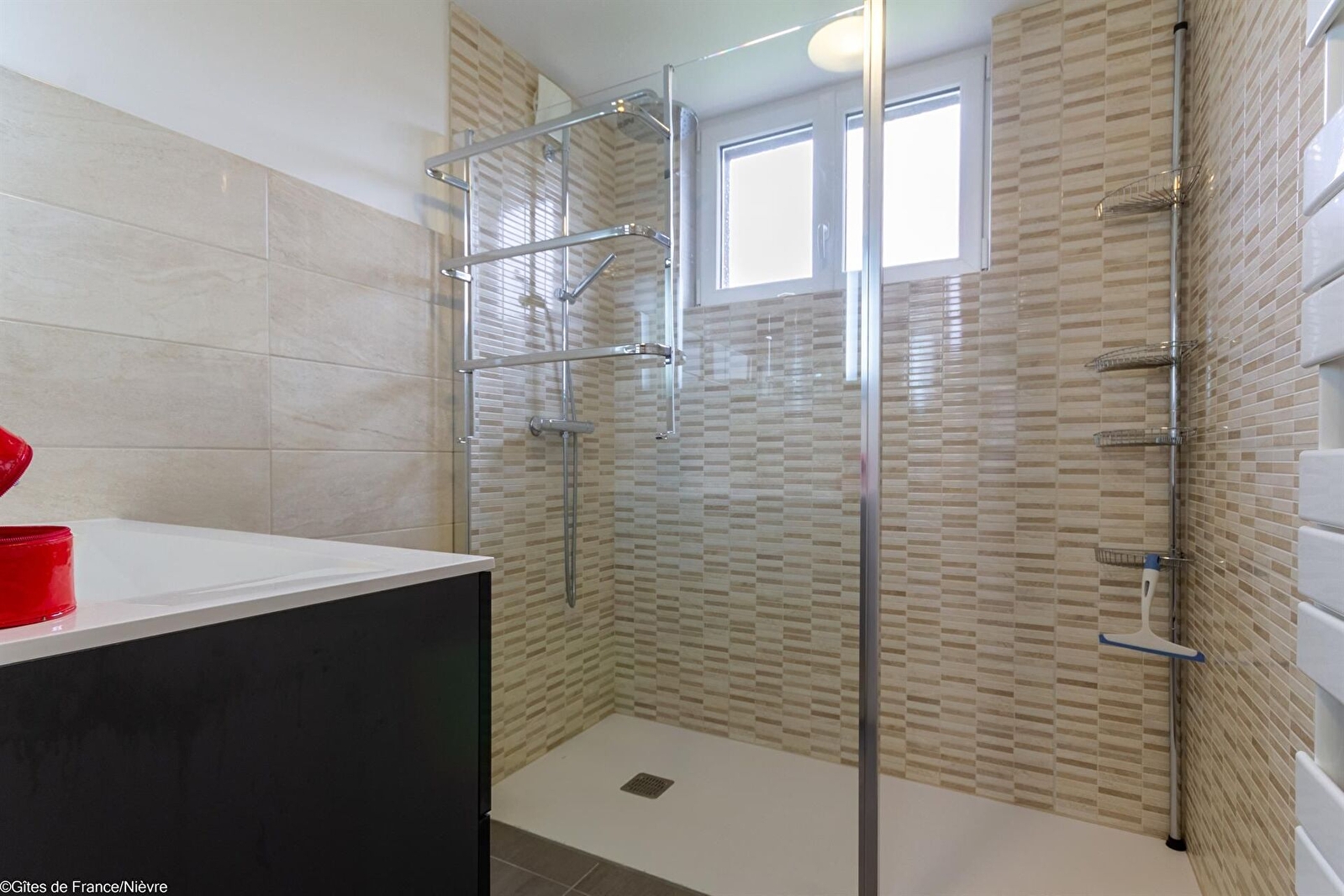 Intérieur du gîte: au rez-de-chaussée, une grande pièce à vivre avec poêle à bois, télé, grande baie donnant sur une terrasse surplombant le jardin; une cuisine équipée, un wc indépendant et une salle d'eau avec douche à l'italienne. A l'étage : 2 chambres spacieuses dont 1 avec 1 lit 140x190 et l'autre avec 2 lits 90x190, climatisation mobile à l'étage.