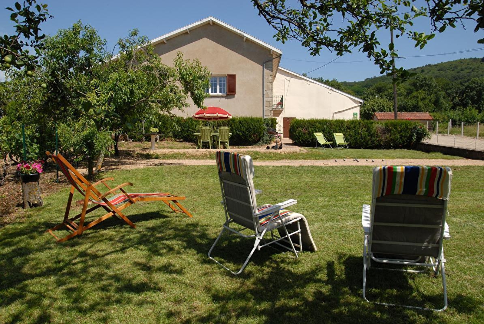 Tous deux viticulteurs retraités, Monique & Raymond vous ouvrent les portes d’une belle maison de vignerons du XIXème siècle soigneusement restaurée en douce villégiature, nichée en lisière immédiate du magnifique & très réputé vignoble du "Val Lamartinien" (du nom de l'illustre hôte des lieux), sur une propriété familiale abritant leur « ancien » domaine désormais exploité par leur fils en "agriculture raisonnée" sous l’agrément HVE "Haute Valeur Environnementale" (dégustation & visite sur réservation). Environnement calme au sein d’un paisible mini hameau juché "en balcon" à flanc de coteau sud-est bien exposé, à deux pas du charmant petit village typique de Serrières. Somptueux environnement préservé en pleine campagne mâconnaise, au creux d’une verdoyante vallée viticole adossée au "Signal de la Mère Boitier" point culminant du Mâconnais (702m), lovée sous les crêtes boisées de deux vastes espaces forestiers (dont un classé & protégé en "Zone Natura 2000" pour son riche écosystème). Superbe écrin paysagé de coteaux de vignobles, prairies & forêts à sillonner lors de ressourçantes balades à pied ou VTT. Site & cadre viticole de toute beauté. Spacieux gîte de bon confort au dépaysant cachet campagnard d’esprit "vintage". Agréable grand balcon-terrasse en partie abrité. Large terrain clos de 350m² comprenant un jardin engazonné & fleuri, une grande cour pavée dotée d’un espace terrasse & terrain de pétanque. Belle vue dégagée sur la campagne environnante.