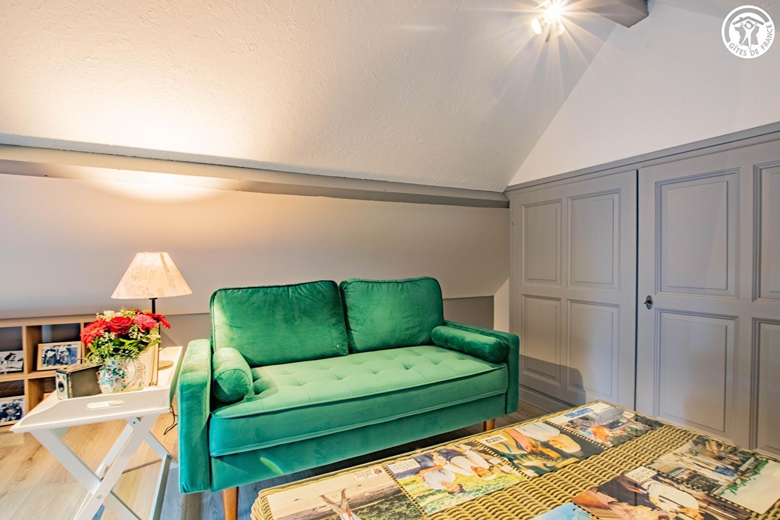 Composition : Maison individuelle jouxtant la demeure des propriétaires et un second gîte (totale indépendance). Chauffage électrique. Service de buanderie gratuit. Rdc : séjour-cuisine-salon, chambre (lit 2 p. 160x200cm), salle d'eau (douche/wc). 1er étage (salon TV soupenté). Parking + jardin clos privatifs. Propriété en commun (8000m²). Commerces dont supermarchés 6 km.
