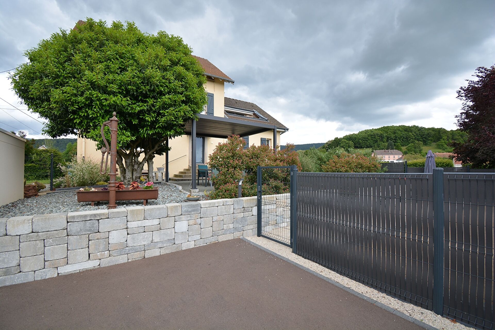 A l'extérieur, une terrasse avec salon de détente, une seconde terrasse avec un espace repas sous la pergolas, transat, barbecue, garage, terrain de pétanque, parking privé dans la cour pour 3 véhicules et un garage sécurisé par alarme de 18m², terrain clôturé.
