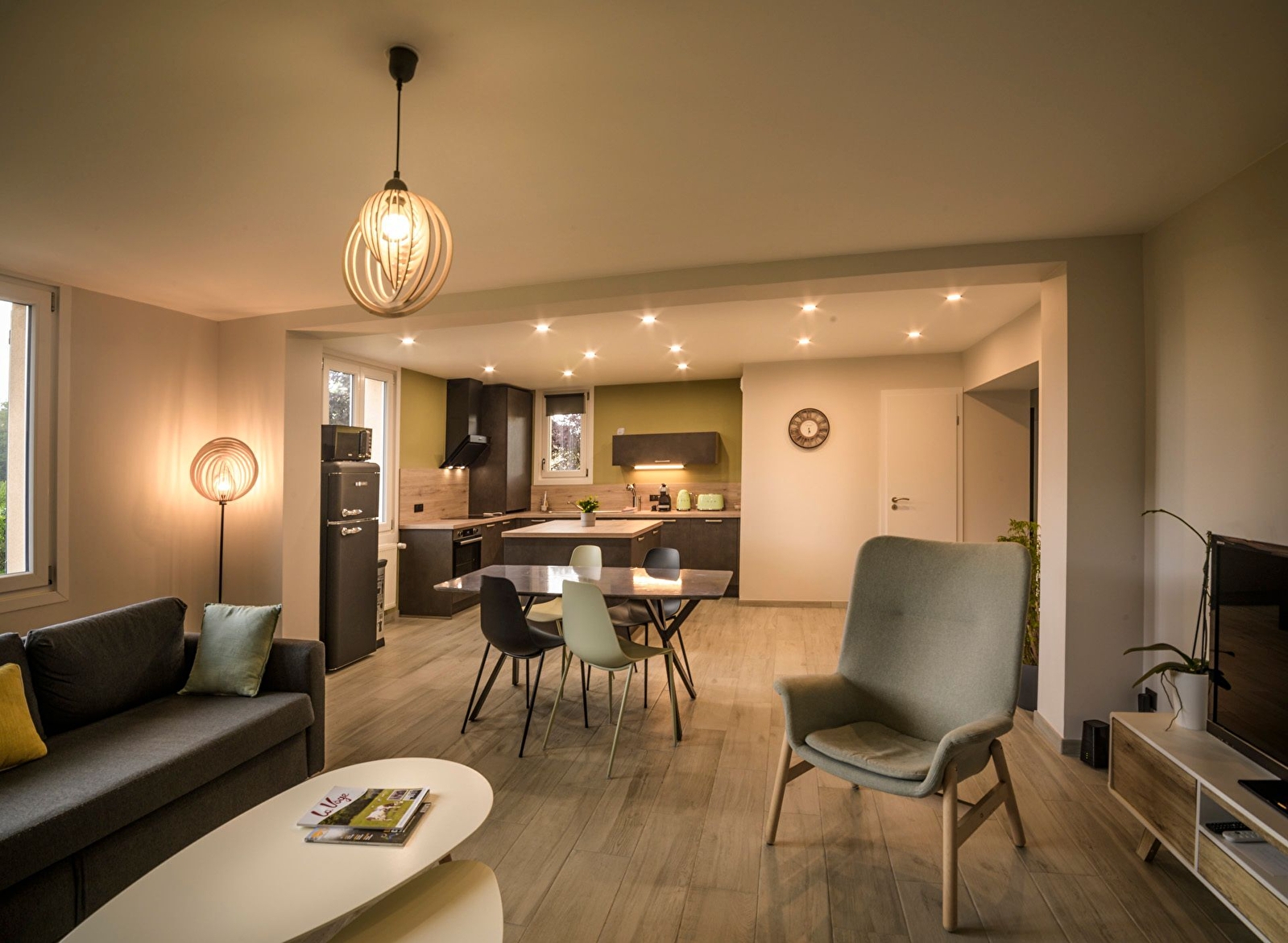 Comprenant une cuisine équipée ouverte sur le salon avec canapé lit convertible, deux chambres avec un lit kingsize 180 x 200cm (possibilité de séparer l'un des lits d'une chambre afin de proposer deux lits de 90x200cm sur demande uniquement), une salle d'eau avec douche à l'italienne, un wc indépendant.