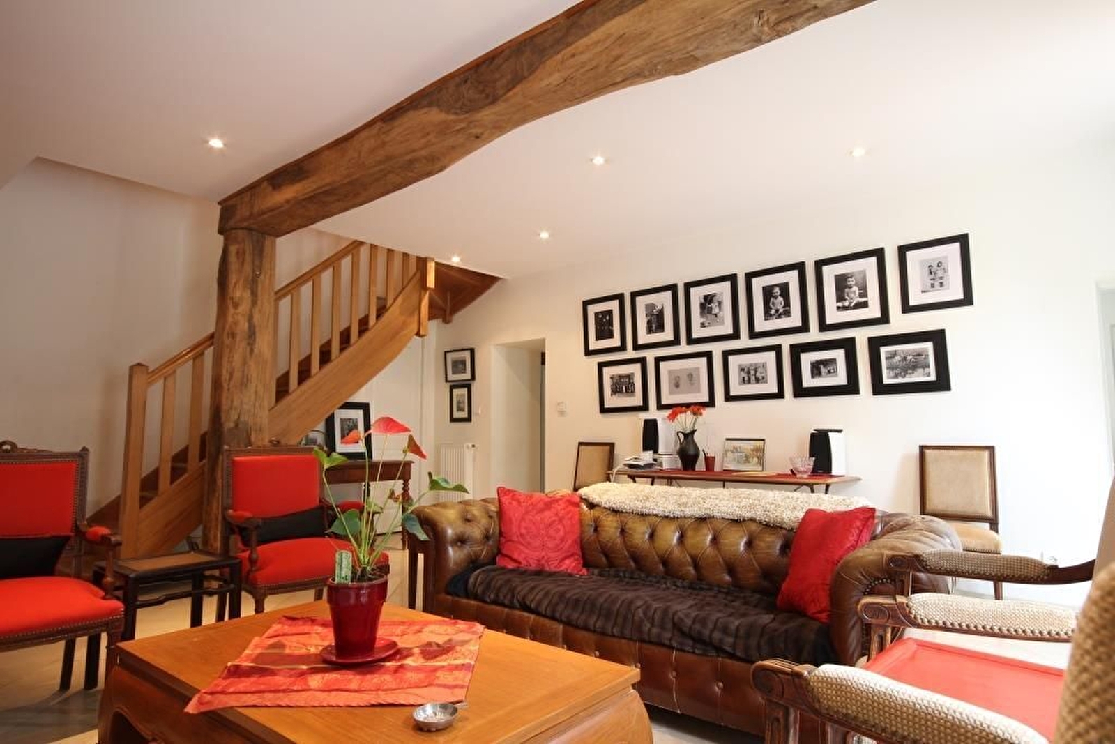 Maison de caractère, indépendante sur grand terrain clos, vallonné et arboré de 3 hectares au bord des bois. Au rez-de-chaussée: grand salon, salle à manger, cuisine équipée, 1 wc, 1 chambre (2 lits 90 cm) avec salle de bain avec wc (accessible handicapés). Etage 1 : 4 chambres (2