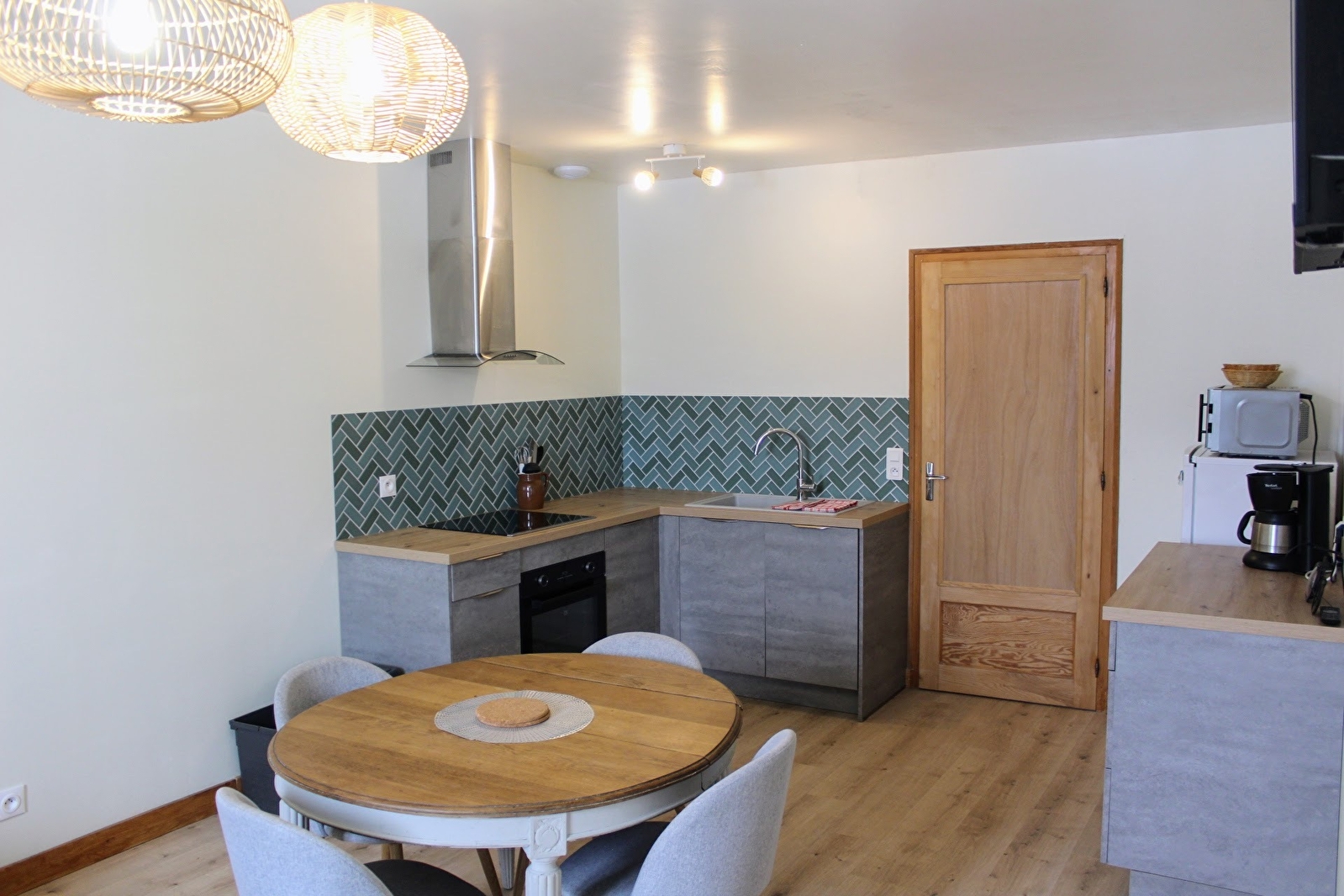 . Un coin cuisine équipée (batterie de cuisine complète, four, réfrigérateur, lave-vaisselle, micro-ondes),