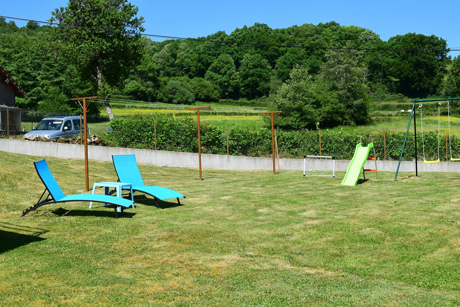 Cour, terrasse avec salon de jardin, barbecue, transats, chaises longues, grand terrain privatif clos avec balançoire, toboggan, buts, ballons et emplacement pour voiture. Tables , chaises et transat pour enfants.