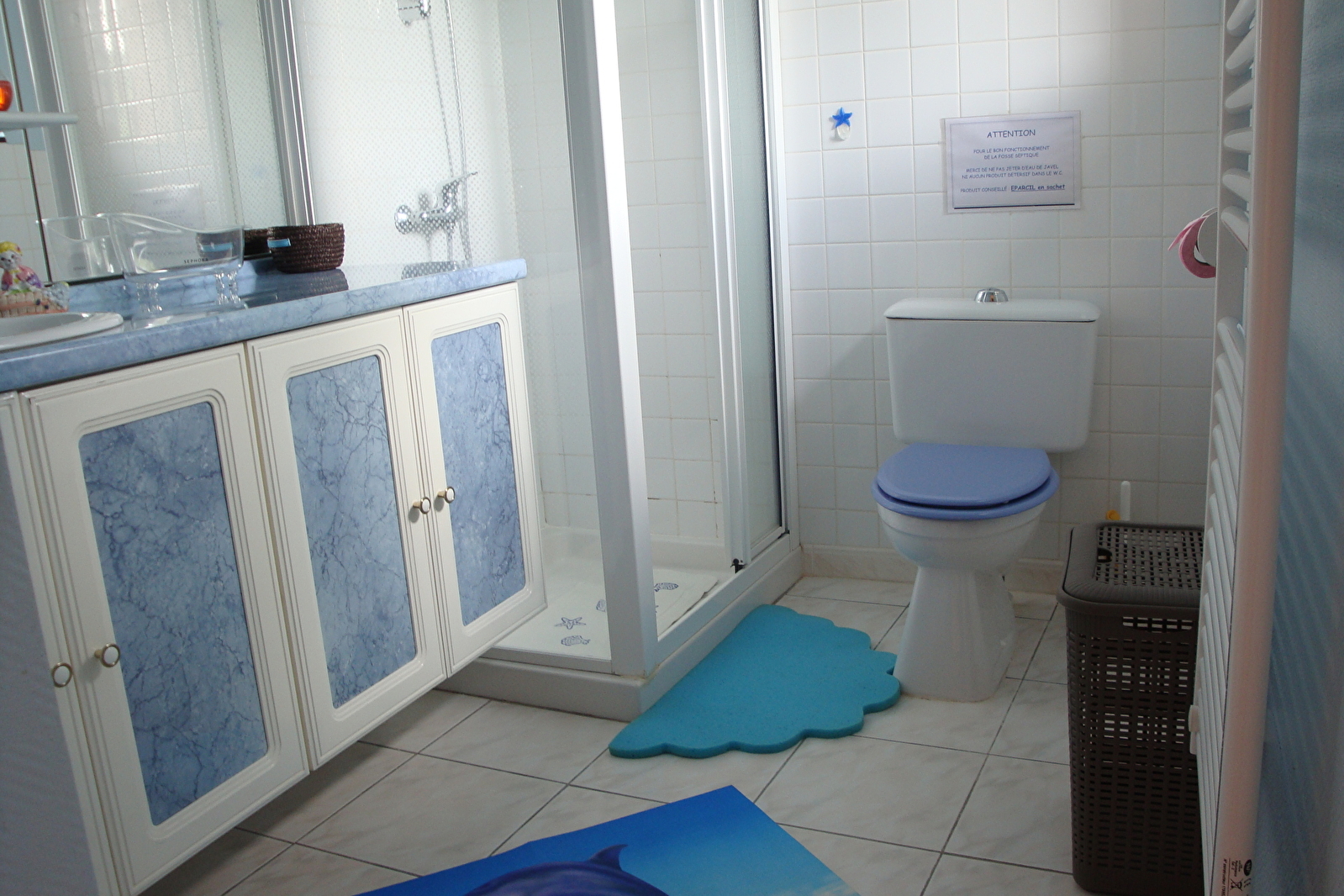 Salle de bain aménagée avec douche et WC. Sèche cheveux.