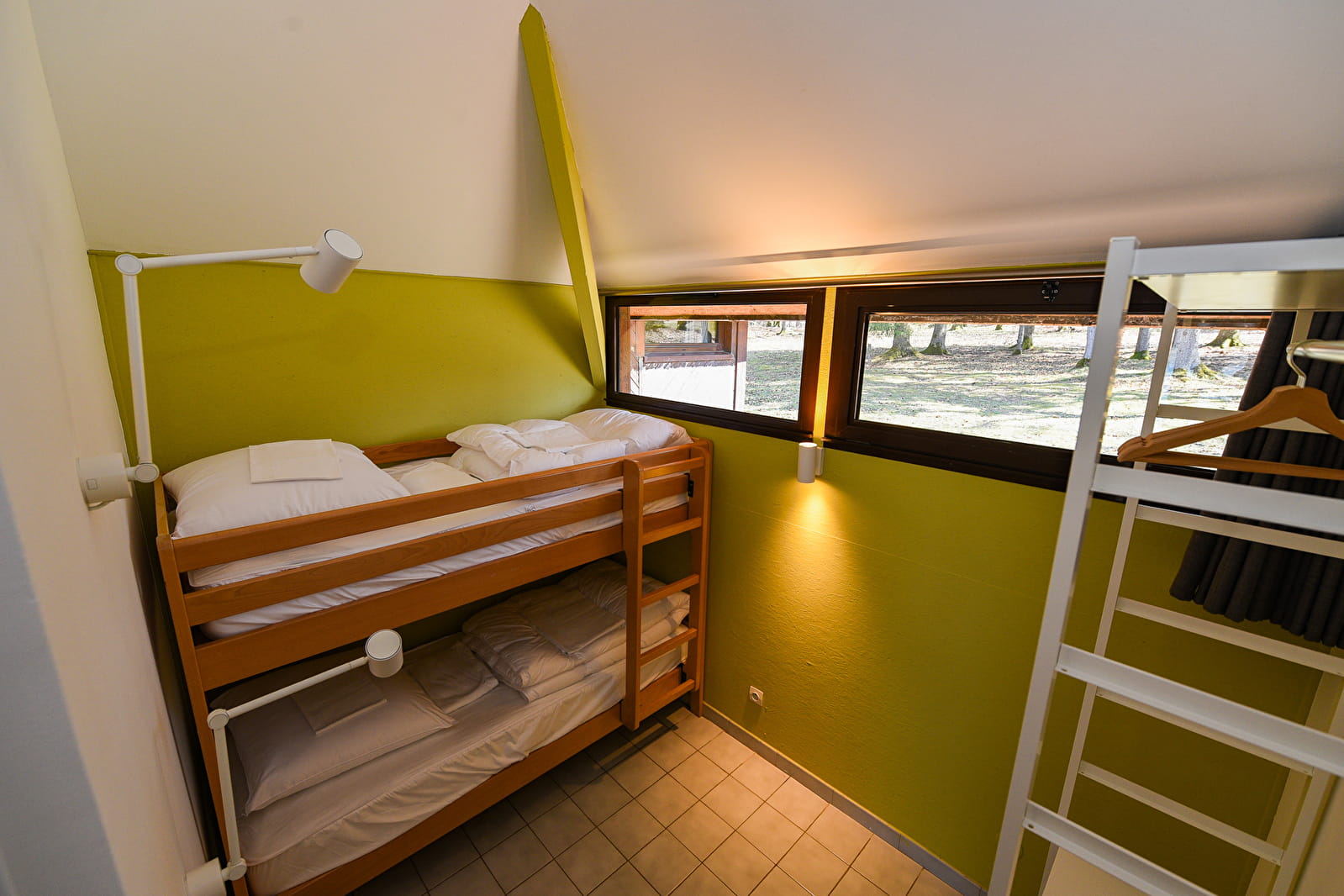 Chaque chalet est composé d'un coin salon (canapé convertible avec véritable literie), kitchenette équipée, d'une première chambre comprenant 2 lits simples, d'une seconde chambre équipée de lits superposés, d'une salle d'eau avec douche à l'italienne & toilettes, ainsi que d'une petite terrasse abritée.
