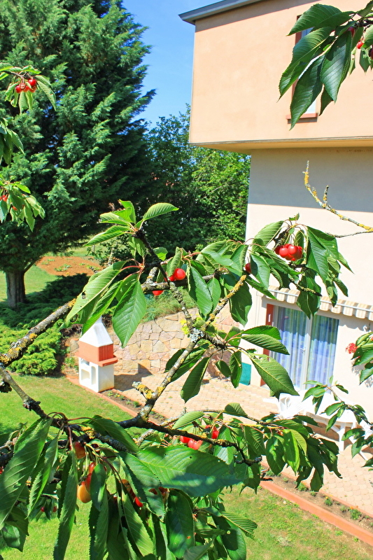 A l'extérieur grande terrasse, avec store 6m x 3,50m, salon de jardin, fleurs autour de la terrasse, et vue sur un grand verger fruitier avec pelouse, loin de la circulation et du bruit, une partie des fruits peuvent ètres récoltés gracieusement pour le locataire pour consommer sur place, demander au propriétaire.