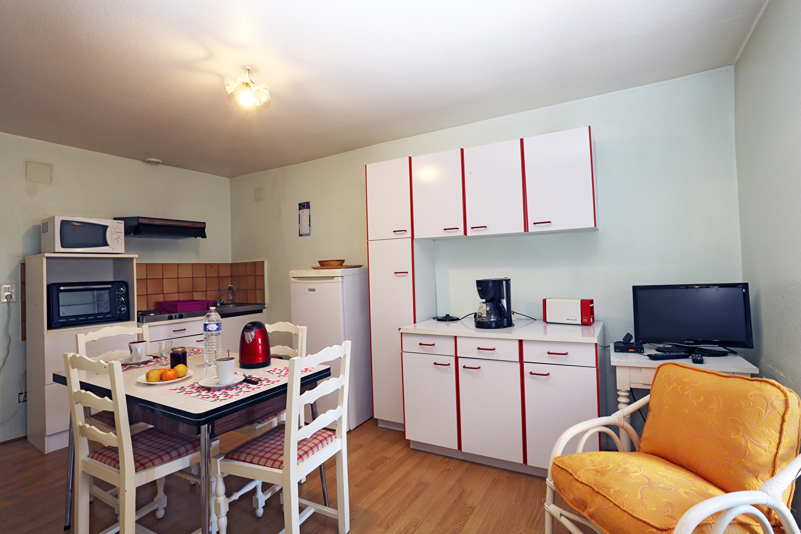 - une salle à manger, comportant un meuble avec toute la vaisselle nécessaire, un coin repas avec une table et quatre chaises, deux fauteuils et une télévision. Une kitchenette propose dans du mobilier adapté (un meuble sous plaques, un meuble étagère) tout le matériel nécessaire (four + four à micro ondes, cocotte minute, cafetière électrique, grille pain, poêles, casseroles en inox, frigidaire).