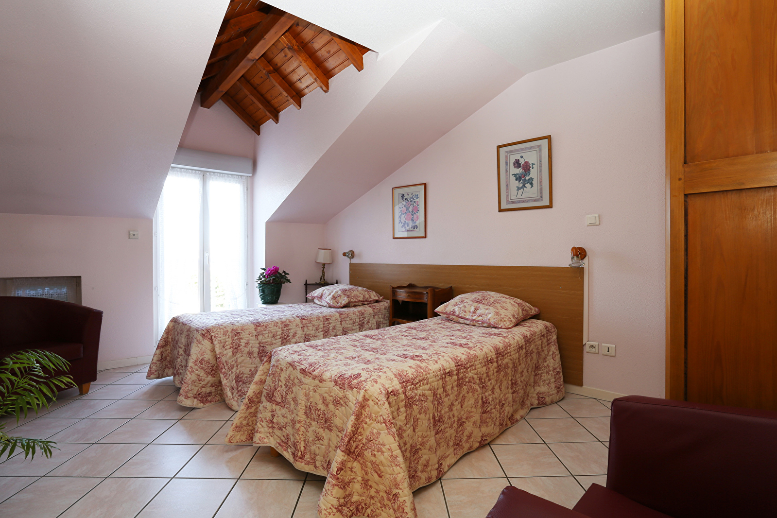 - une chambre avec deux lits de 80/190, une armoire, un petit meuble, une table de chevet, deux fauteuils, deux tableaux et une télévision.