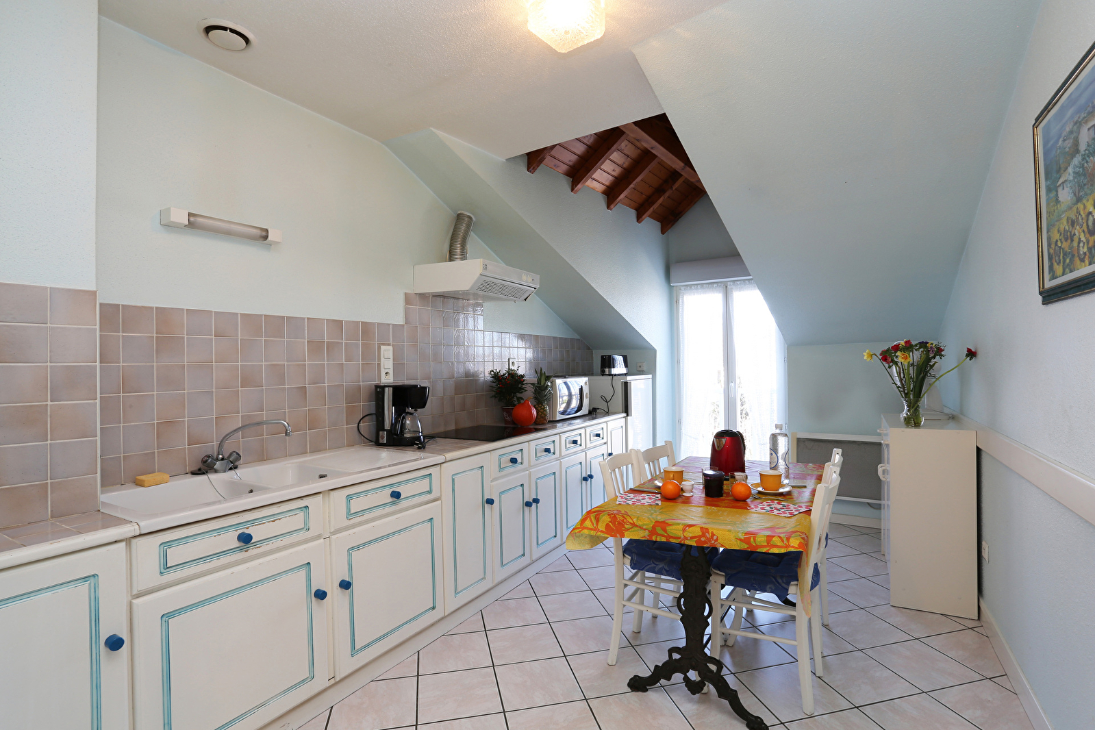 - une salle à manger, comportant un meuble avec toute la vaisselle nécessaire, un coin repas avec une table et quatre chaises. Une cuisine propose dans du mobilier adapté (un meuble encastré avec évier) tout le matériel nécessaire (quatre plaques électrique, hotte, frigidaire, four à micro-ondes et grill, frigidaire, cafetière électrique, cocotte minute, grille pain, poêles et casseroles en inox).