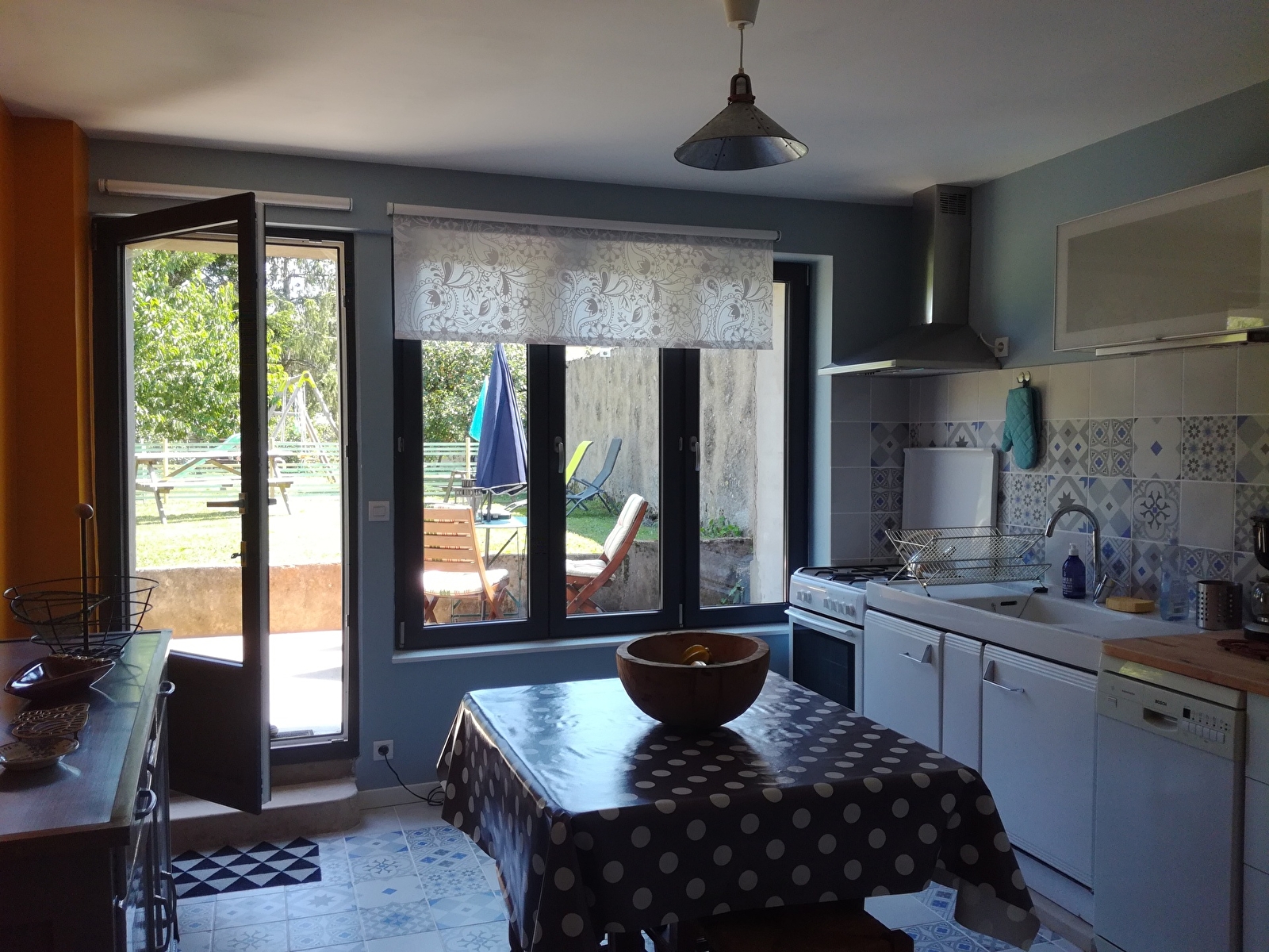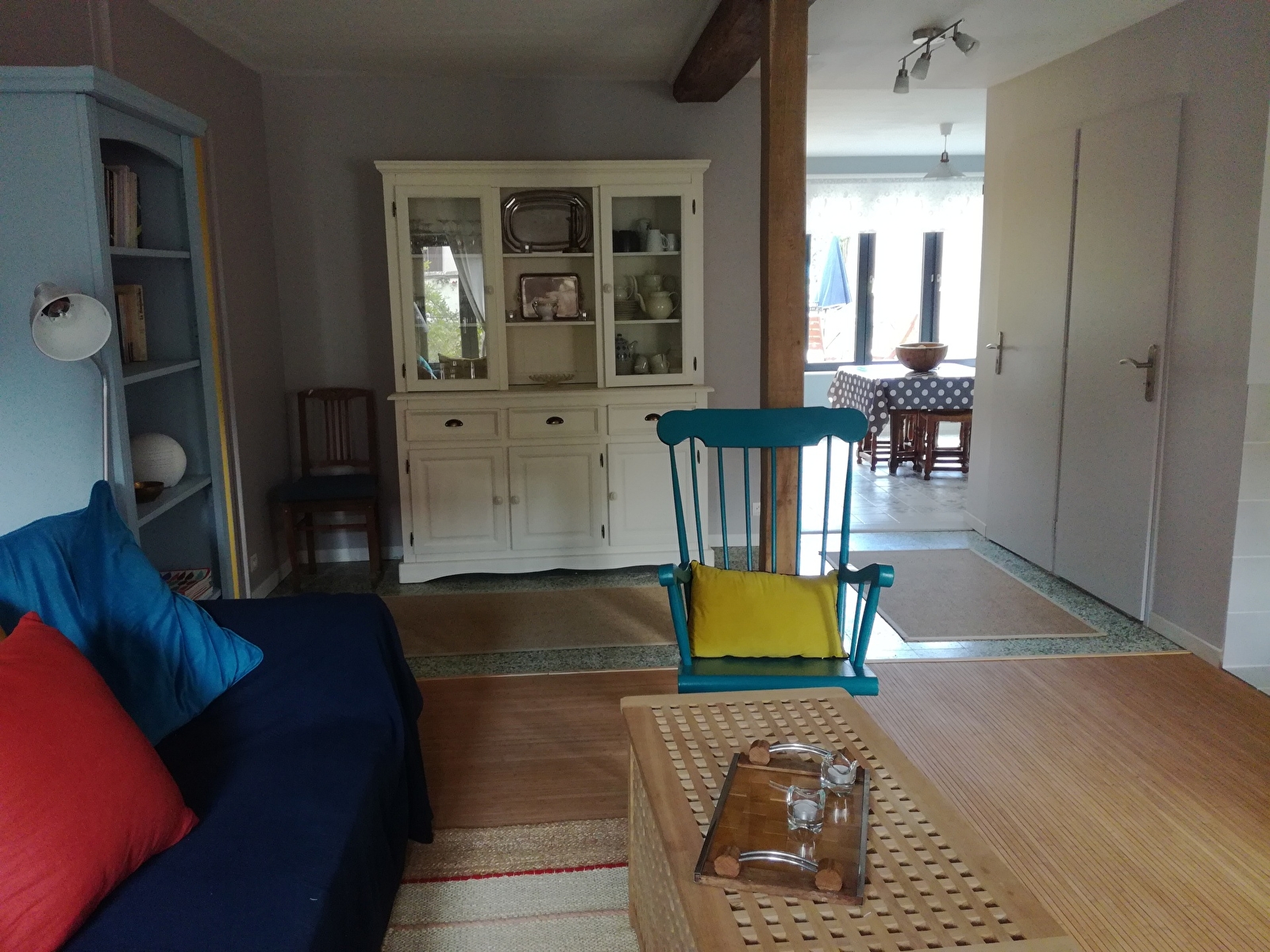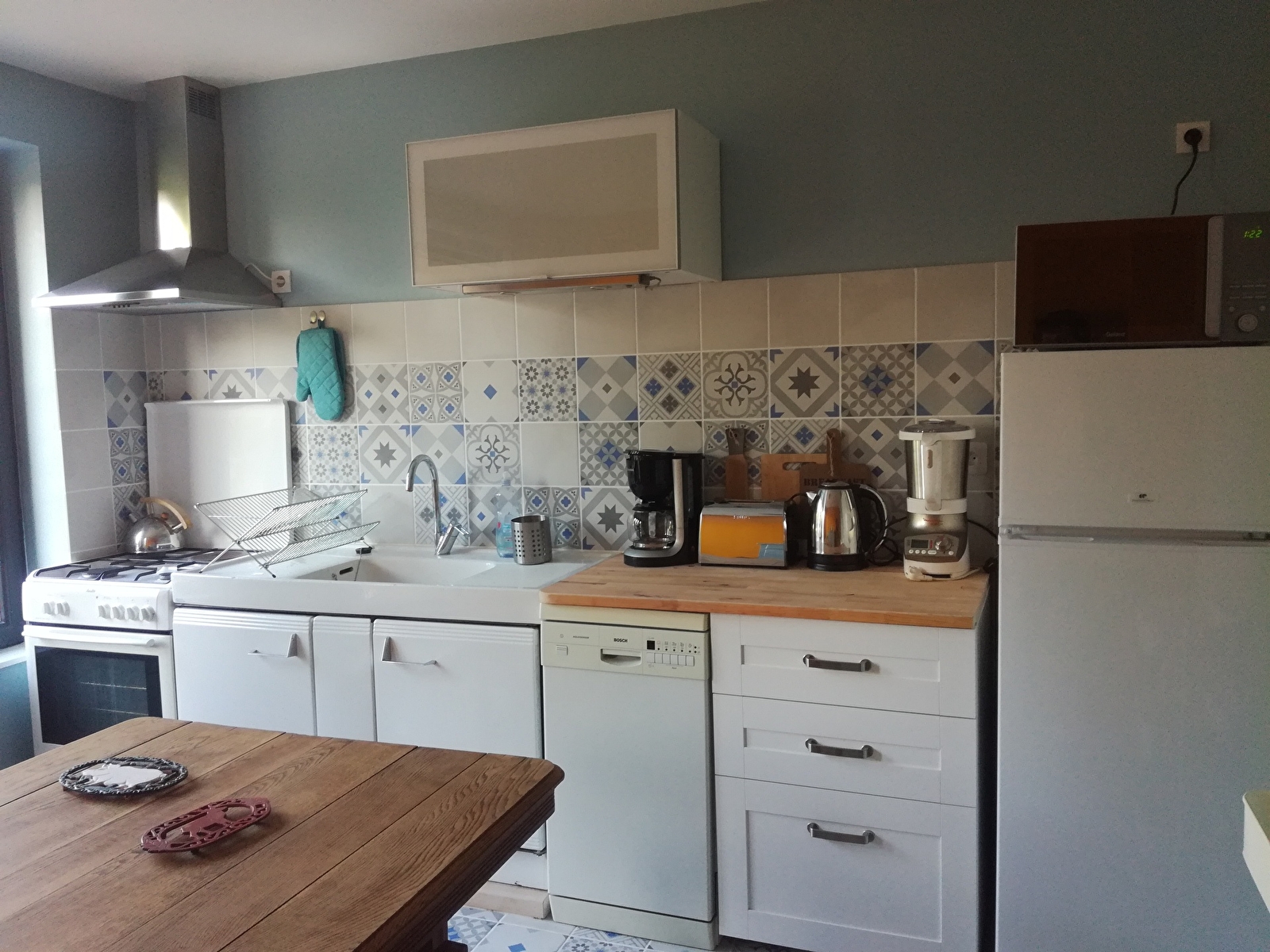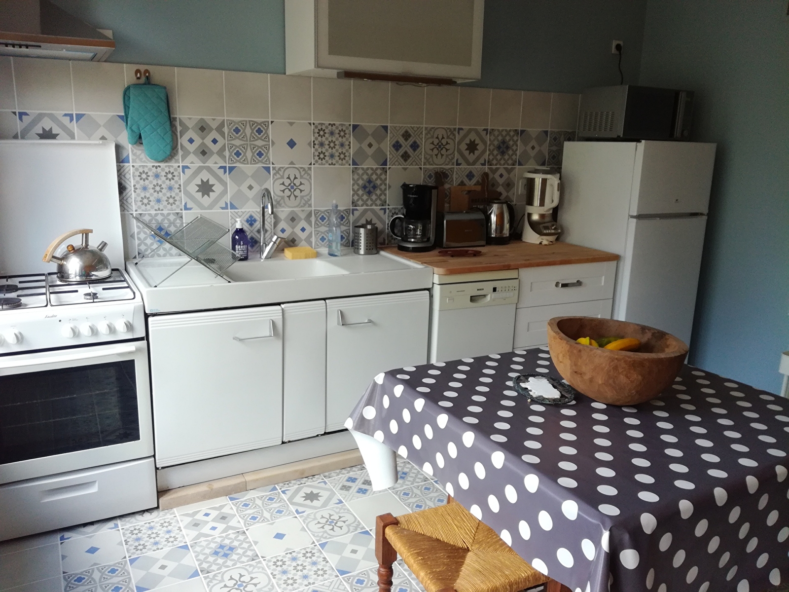 RDC : entrée, séjour avec coin salon et coin repas, cuisine assez grande pour y prendre les repas (lave-vaisselle), directement ouverte sur jardin et terrasse, WC, buanderie (lave-linge, table à repasser, fer)
