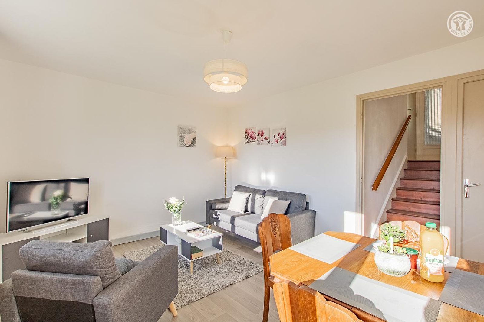 Composition : Maison individuelle sur 2 niveaux avec demi-étage (entrée de plain-pied par le haut depuis la cour). Chauffage central gaz. Buanderie au sous-sol. Rdc : séjour-cuisine-jardin. Demi-étage : bureau, Wc indépendant. 1er étage : 2 chambres (lit 2 p. 140x190cm / lit 2 p. 140x190cm), salle de bain (baignoire). Parking + local vélos + mini-terrasse abritée + jardin (800m²) privatifs. Supermarché à 600m. Commerces à 800m.