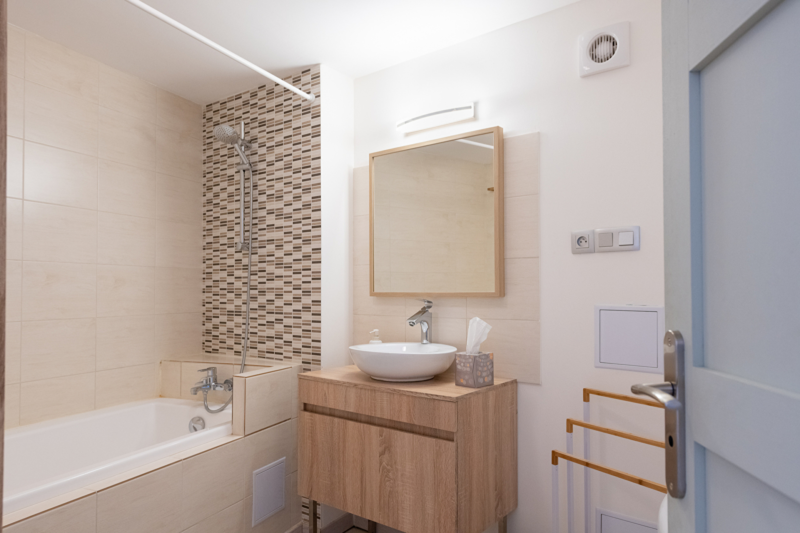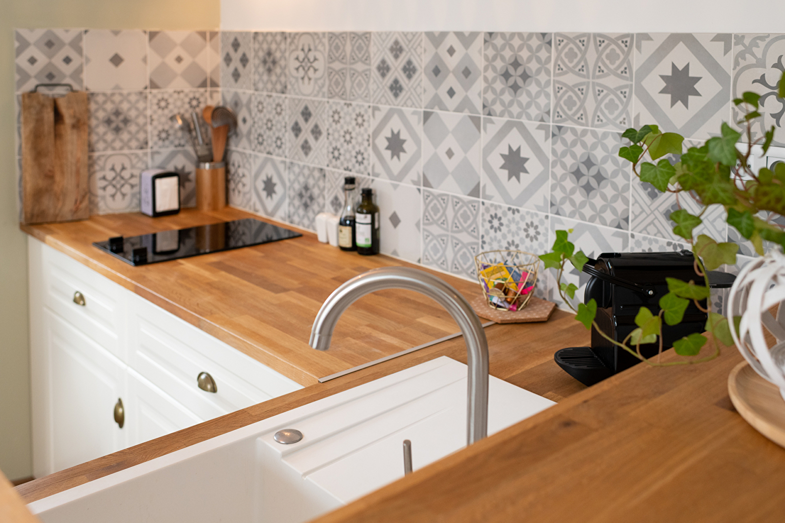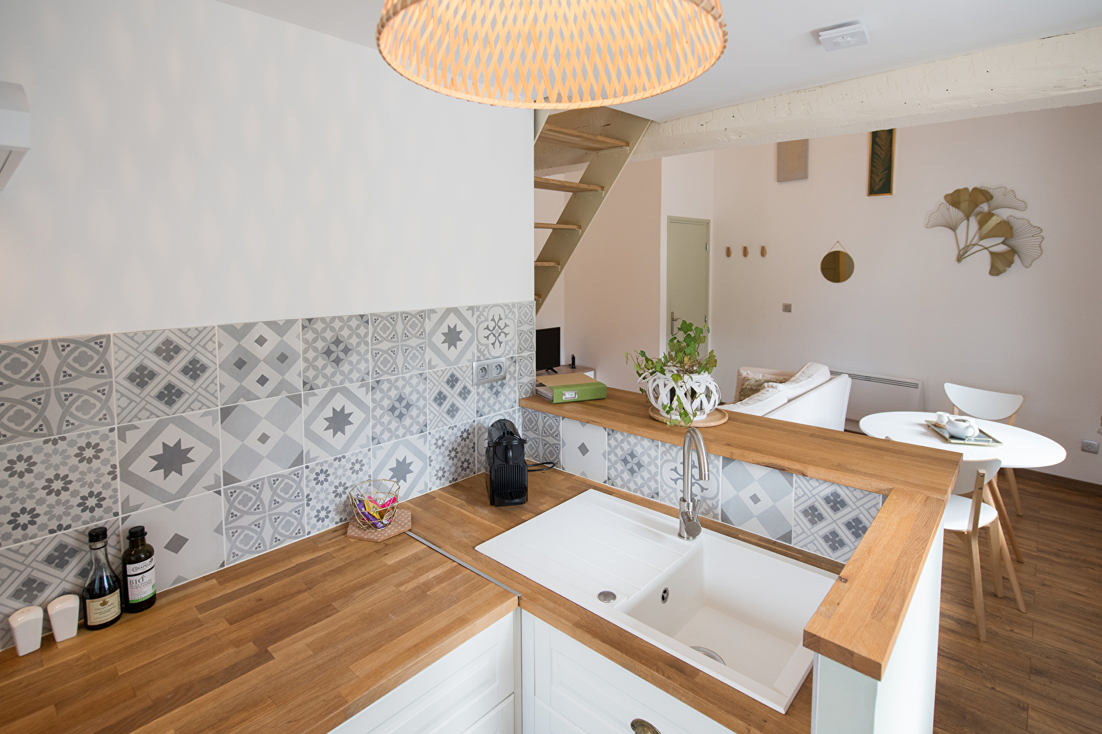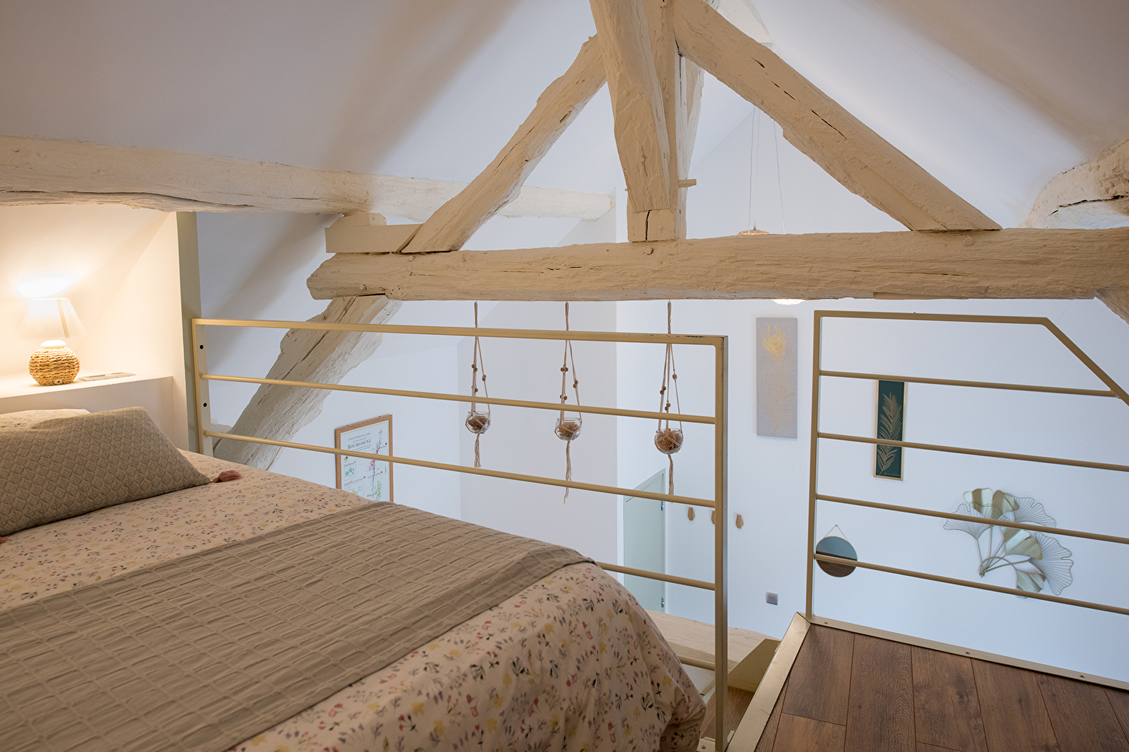 Appartement climatisé de 45 m² au 1er étage, salon avec belle hauteur sous plafond, jolie chambre en mezzanine, cuisine ouverte (réfrigérateur, plaques, four combiné micro-onde, bouilloire, cafetière, cafetière Nespresso), salle de bain avec baignoire.