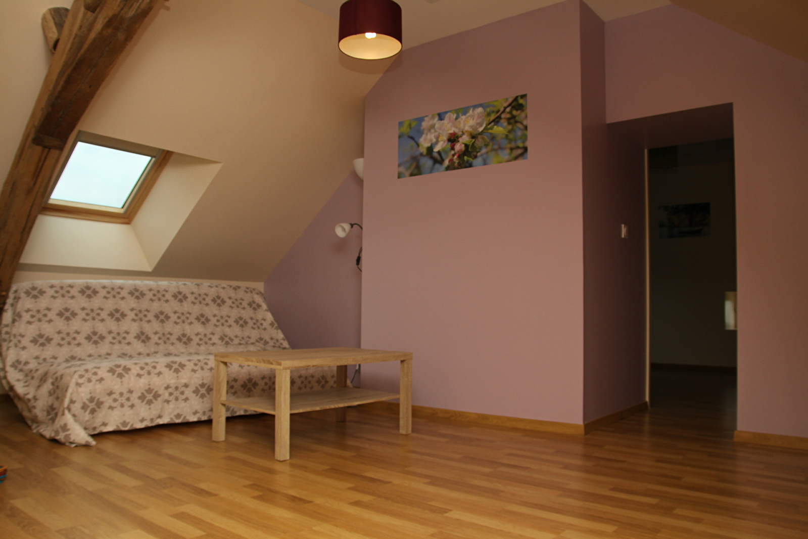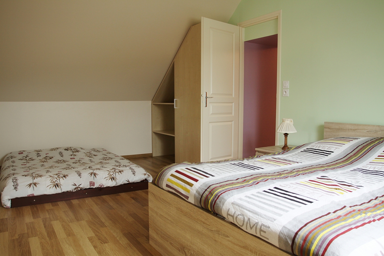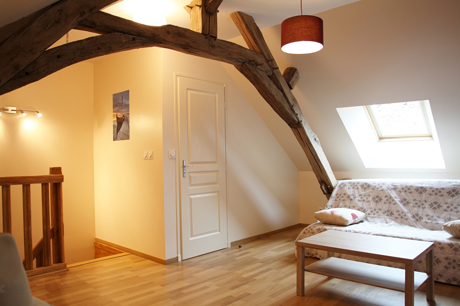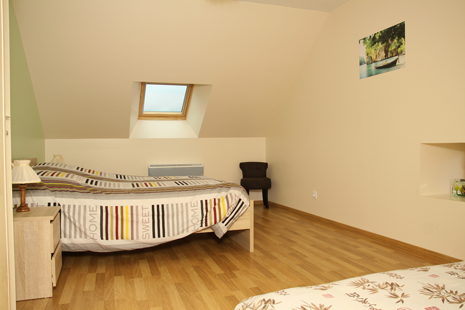 A l'étage : 1 grande chambre avec 2 couchages 140. Coin salon/lecture sur mezzanine avec télévision, salle de bain/wc.