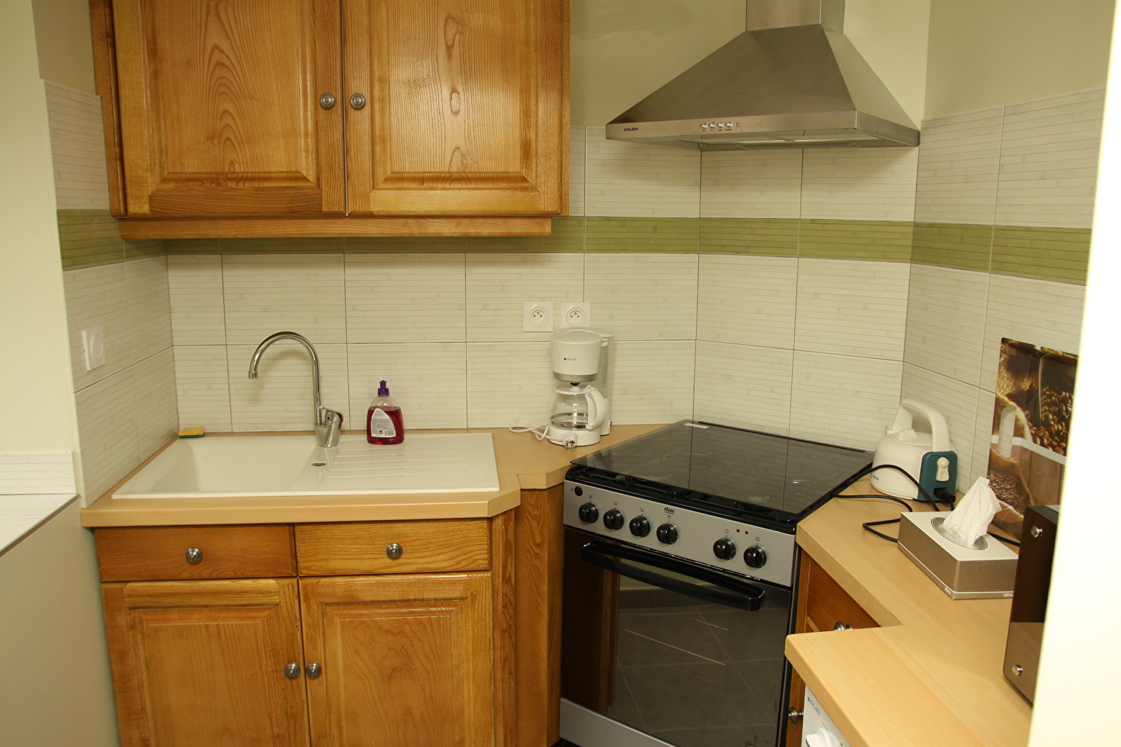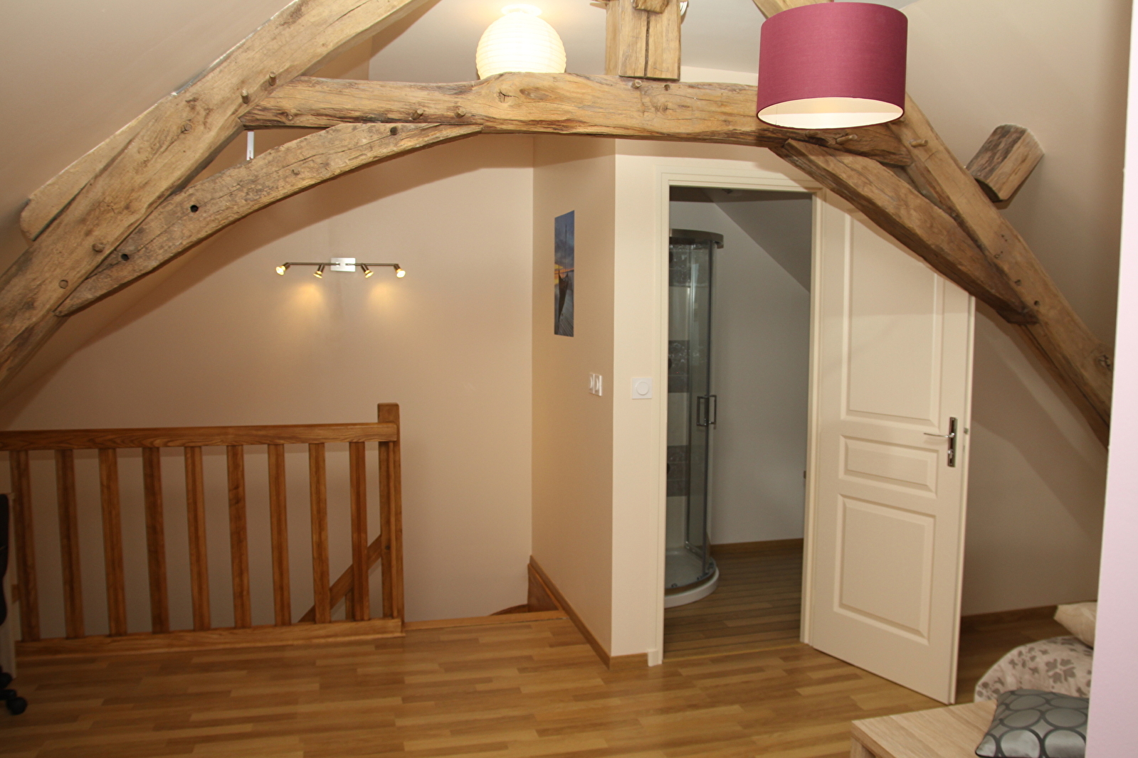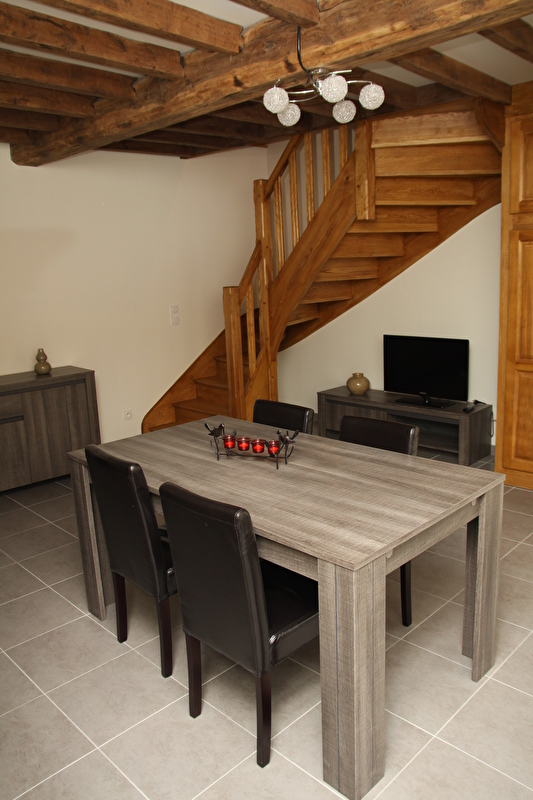 Au rez-de-chaussée : pièce à vivre avec poêle à bois, télévision, cuisine, 1 wc, 1 chambre avec lit 140 et salle de bain attenante avec douche à l'italienne.