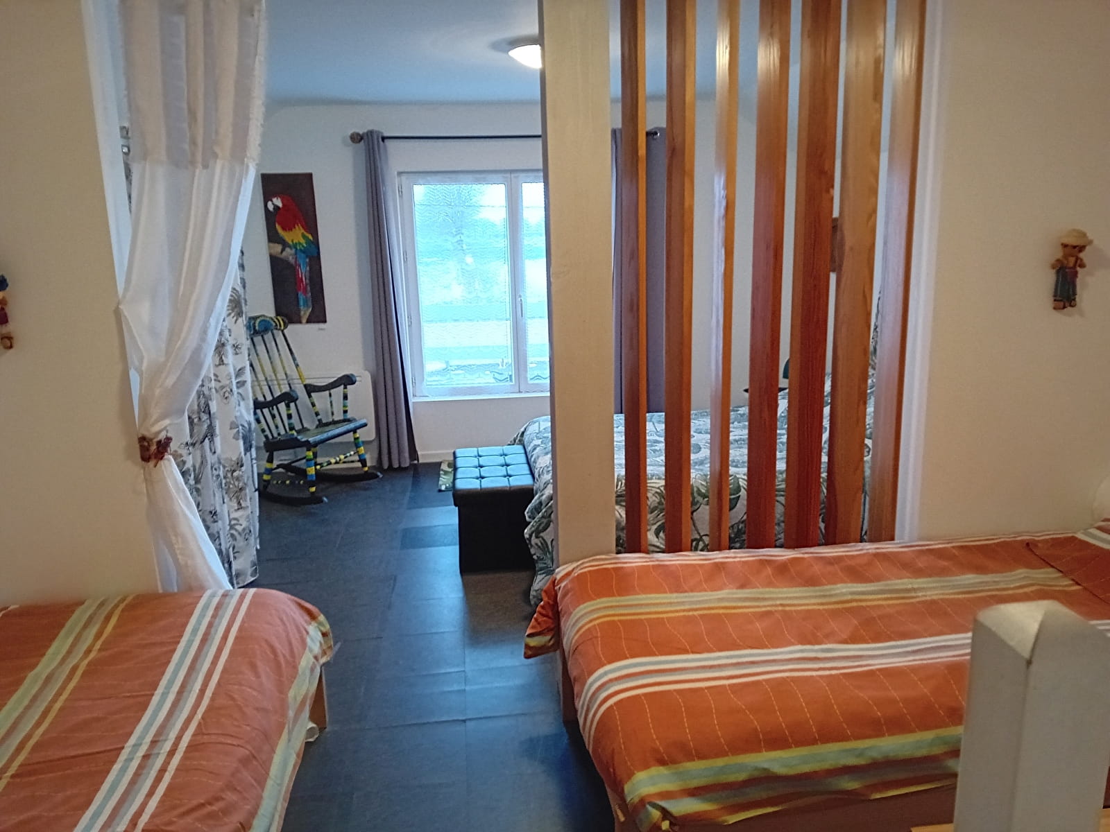 Petite kitchenette, salle de bain, lit canapé dans la pièce principale et 4 couchages à l'étage (un lit double et deux lits simples). Possibilité d'ajouter en supplément une chambre pour 4 personnes située dans le même bâtiment.