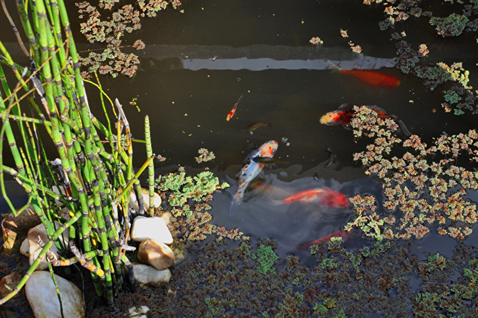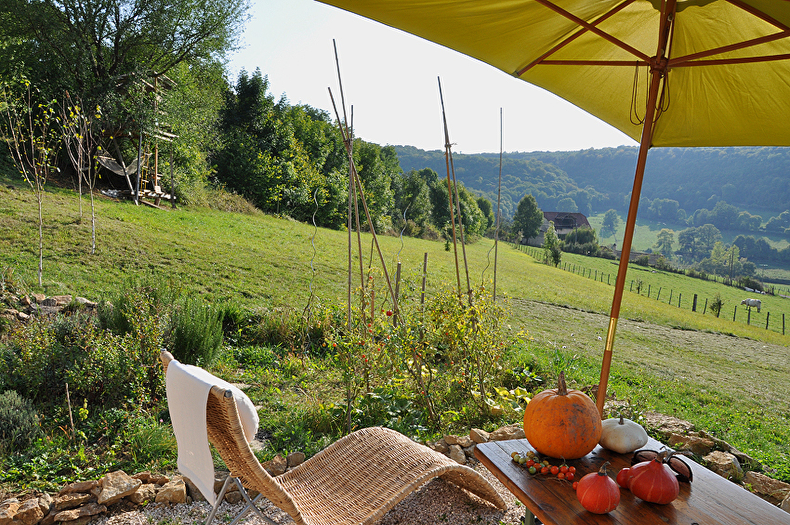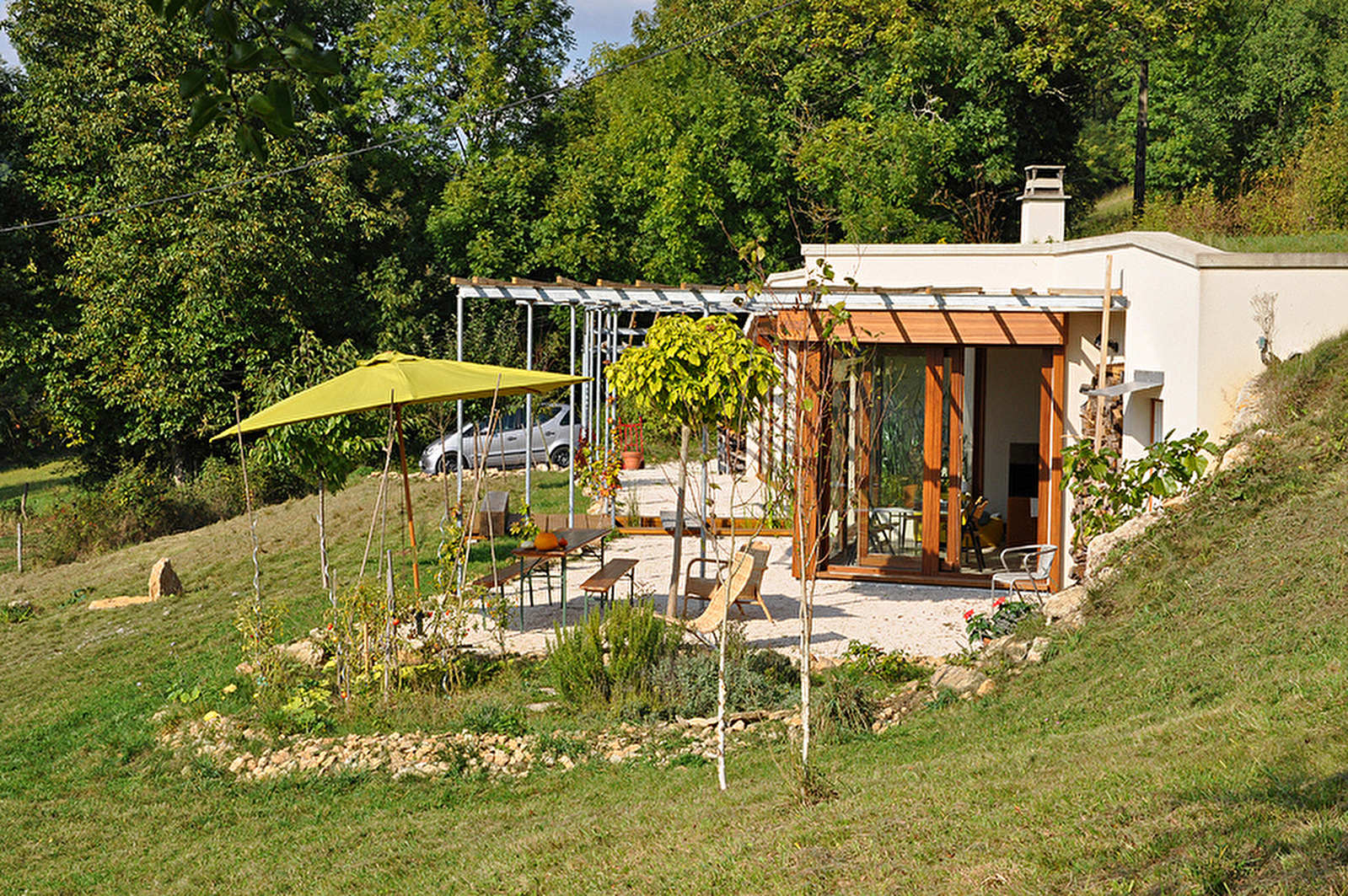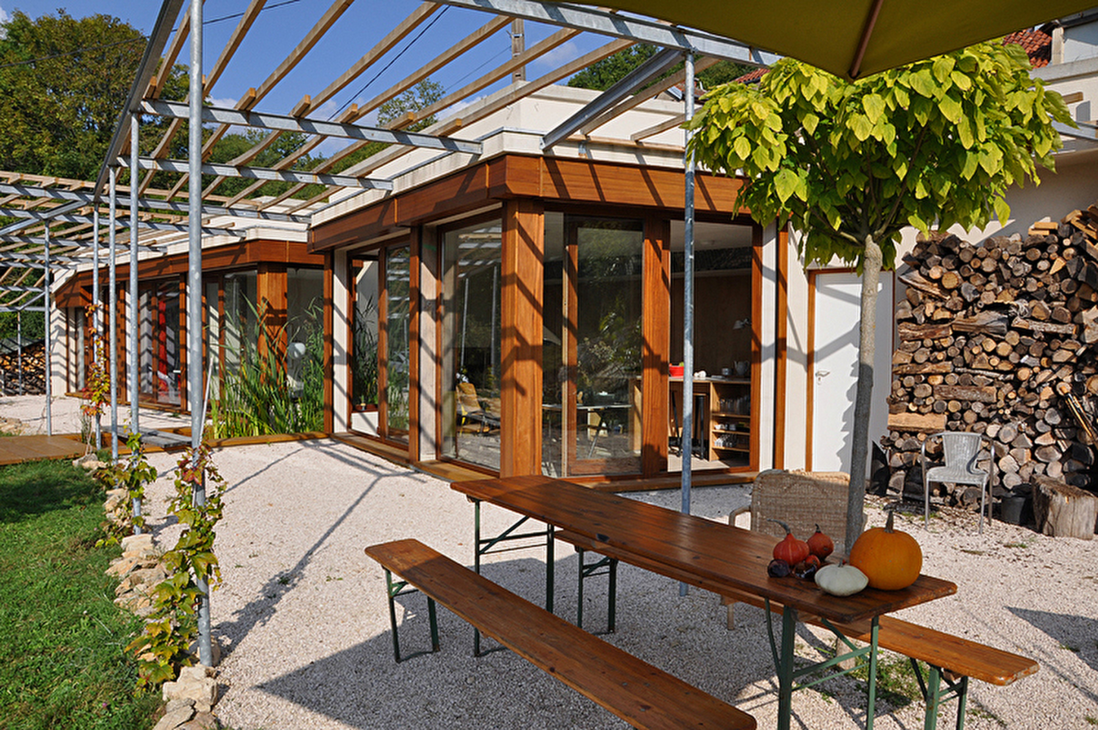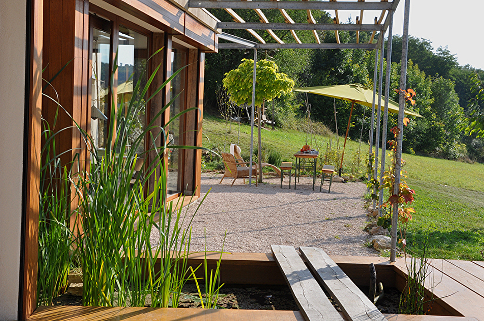 Les pièces sont toutes accessibles de la terrasse par la façade vitrée et donnent sur un terrain vert et arboré de 4000 m2 sans aucun vis-à-vis ; l'espace permet différentes activités. Pour les enfants, il ya une cabane dans un arbre, un hamac et une balançoire. La pergola et ses plantes abritent du soleil, un solarium avec un banc en chêne invite à la détente et à la rêverie autour d'un bassin où nagent des poissons.