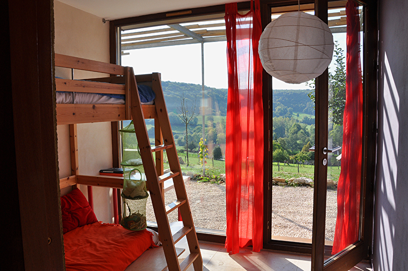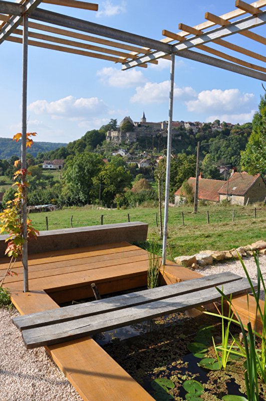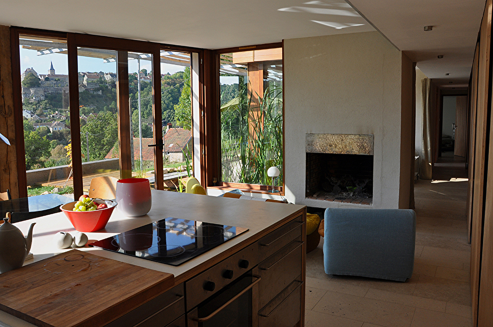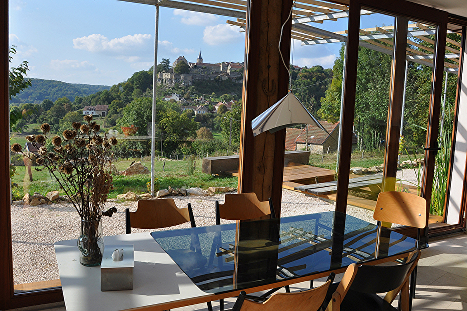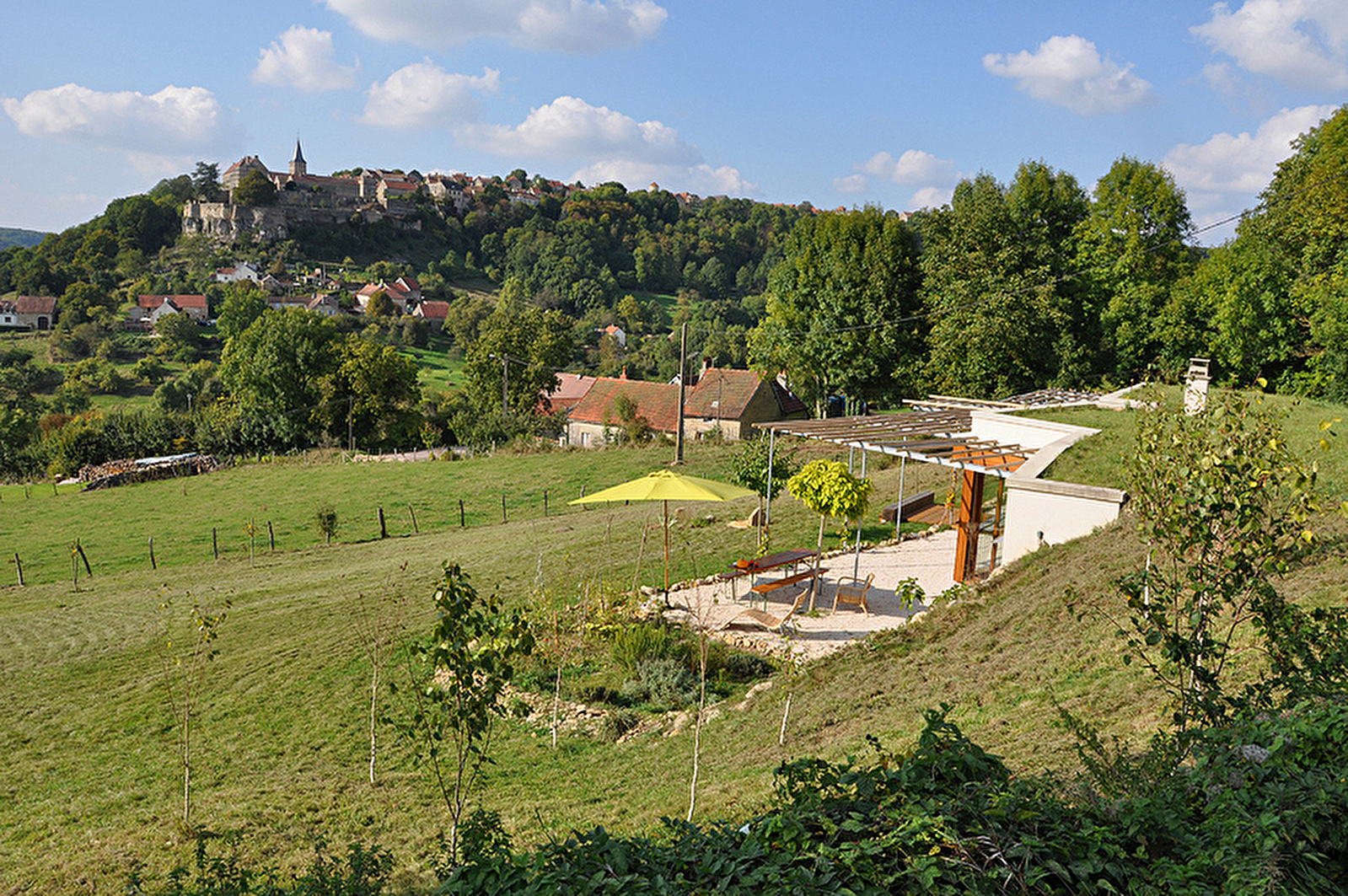 Situé sur la colline en face de Frôlois avec vue magnifique sur le château et la vallée, dans le calme absolu et tout proche de tous les ' Haut lieux de Bourgogne ', maison d'architecte construite en matériaux naturels, vitrée sur toute sa longueur, plain-pied, meublée pour 4 à 6 personnes, avec terrasse, bassin et terrain de 4000qm : séjour avec cheminée + cuisine équipée, chambre avec canapé/lit, chambre enfant avec lit superposé, chambre avec grand lit, salle de bain avec douche à l'italienne, l'ensemble spacieux et lumineux sur environ 100 qm.