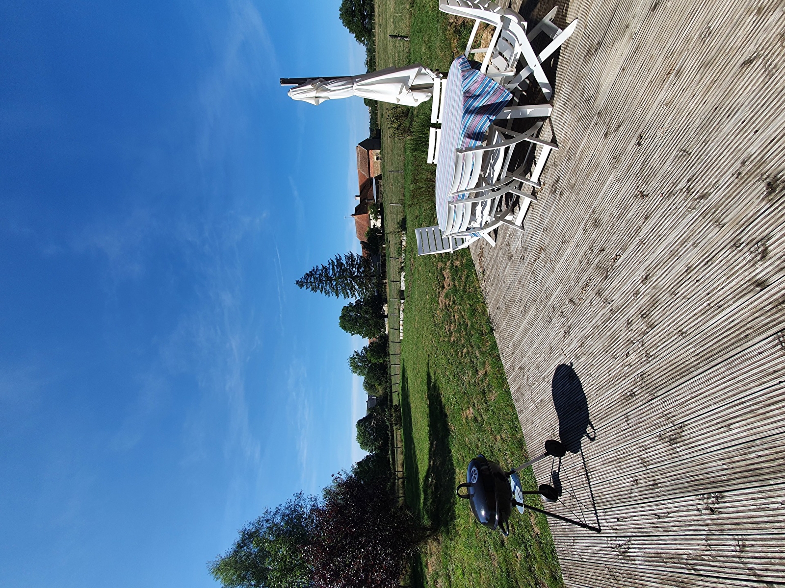 Terrasse avec mobilier de jardin pour les repas en plein air.
