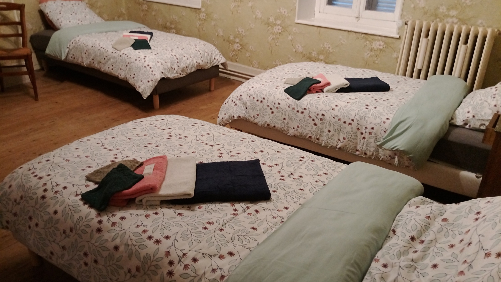 Etage : 2 chambres avec lit double , 1 chambre 2X lits simples . chambre bébé , sur demande : box , tapis à jouer , chaise haute ...