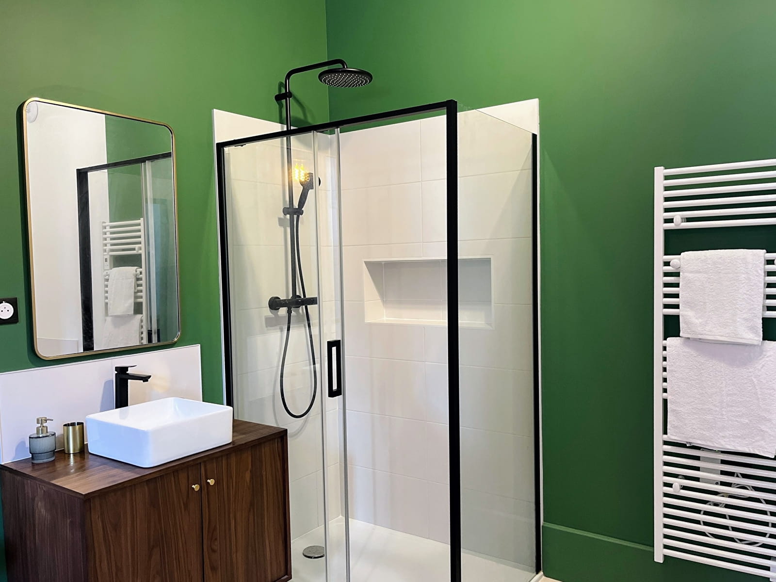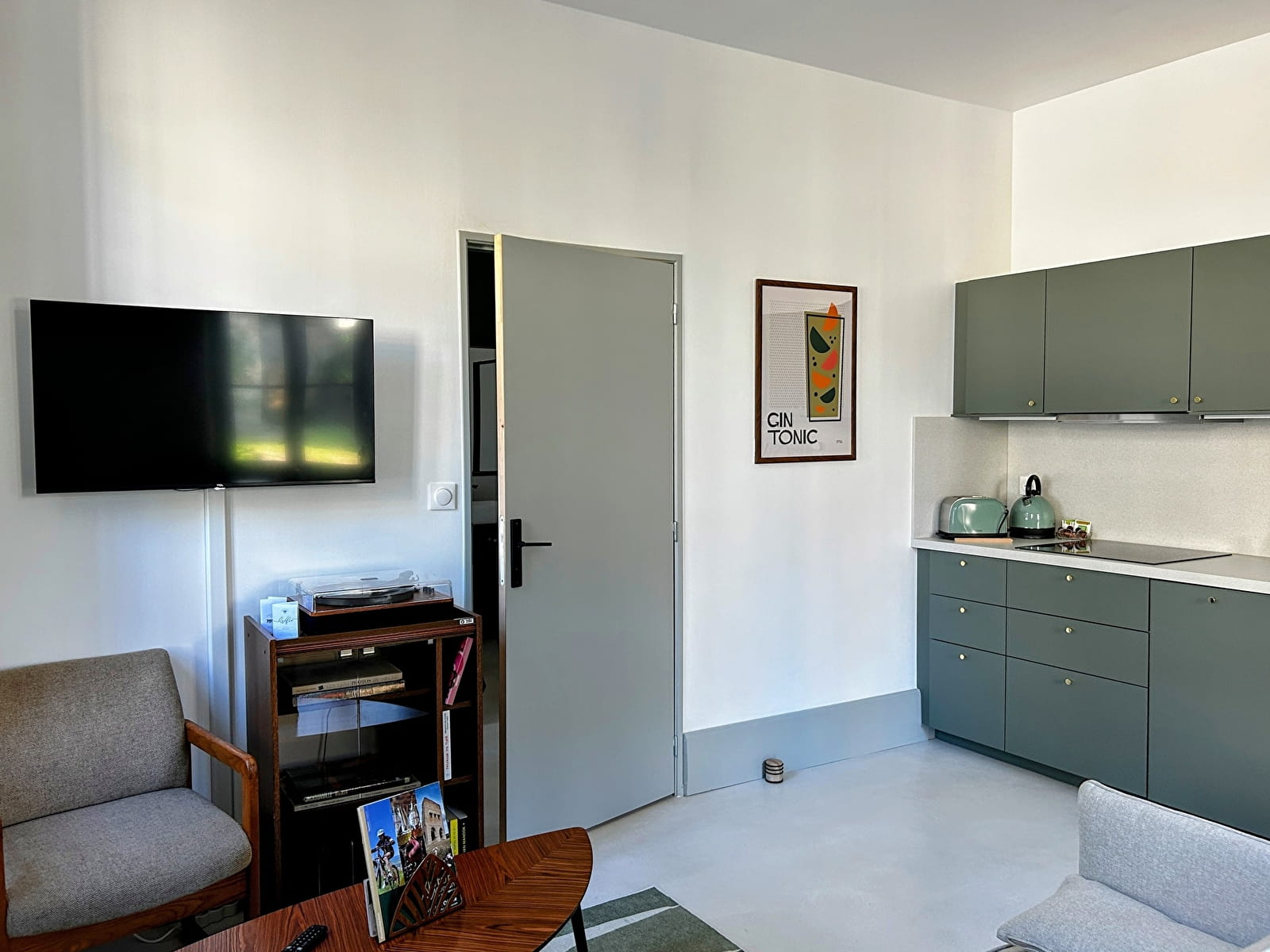 - un coin séjour de 20 m² avec canapé-lit de 140cm x 200cm (confort hôtelier et pouvant accueillir deux adultes), ouvert sur une cuisine toute équipée (four, plaques vitrocéramiques, lave-vaisselle, frigo, cafetière Nespresso, grille-pain, bouilloire...), un coin salle à manger, avec vue sur les muses du domaine et le séquoia géant.