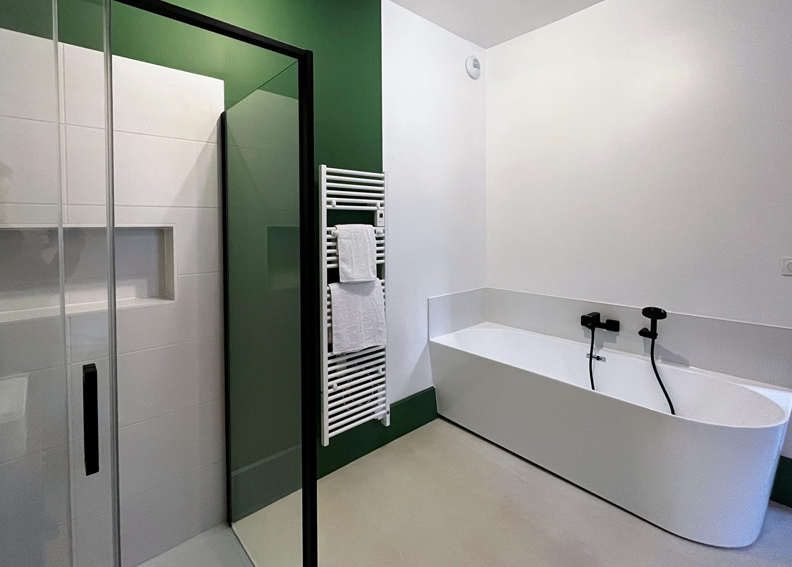 Une chambre avec un lit queen size (160cm x 200cm), ouverte sur une salle de bain avec douche et baignoire.