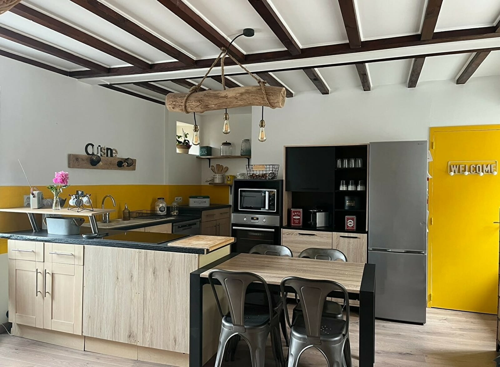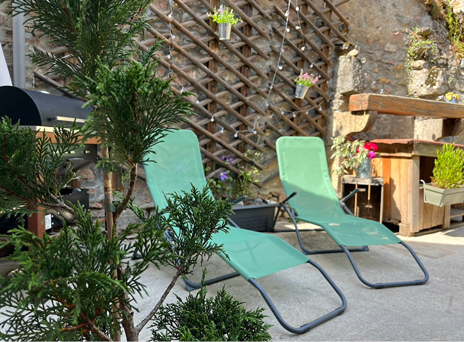 Cuisine ouverte avec tout le nécessaire donnant sur une terrasse aménagée avec table et chaises, barbecue, bains de soleil.
