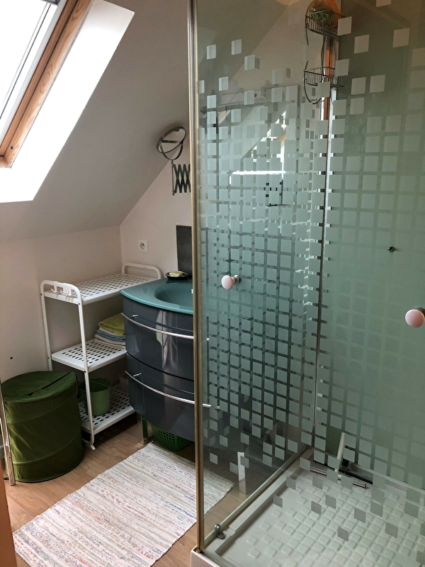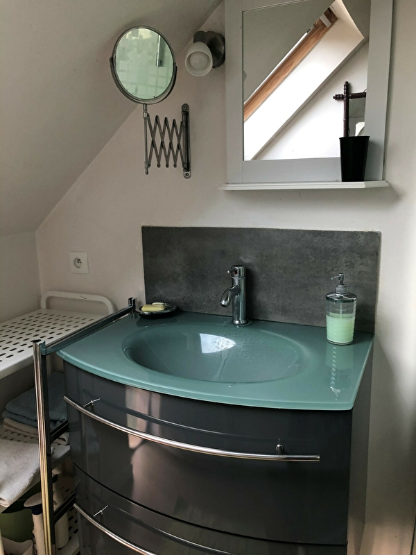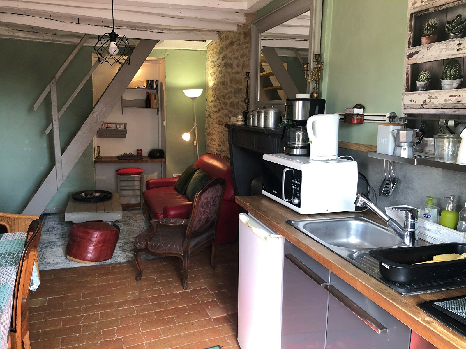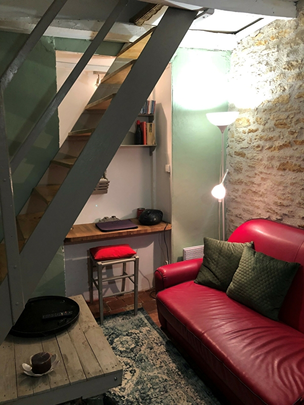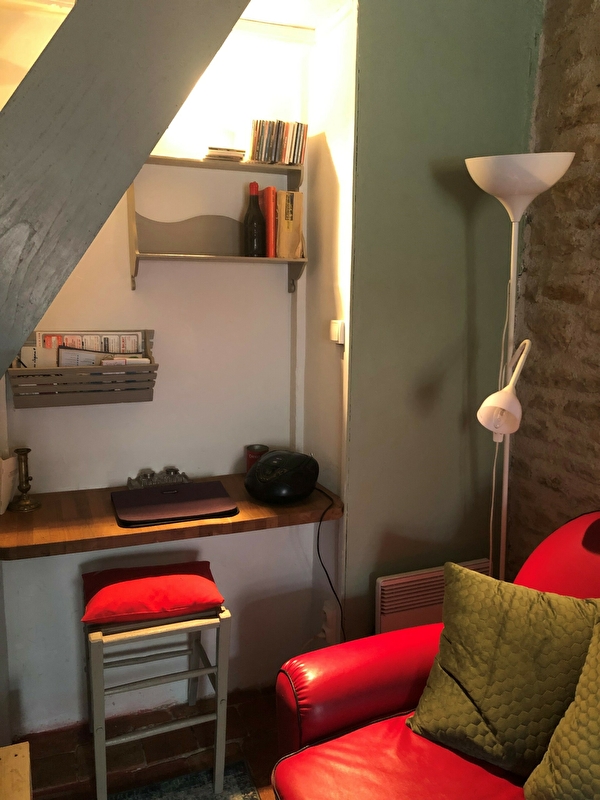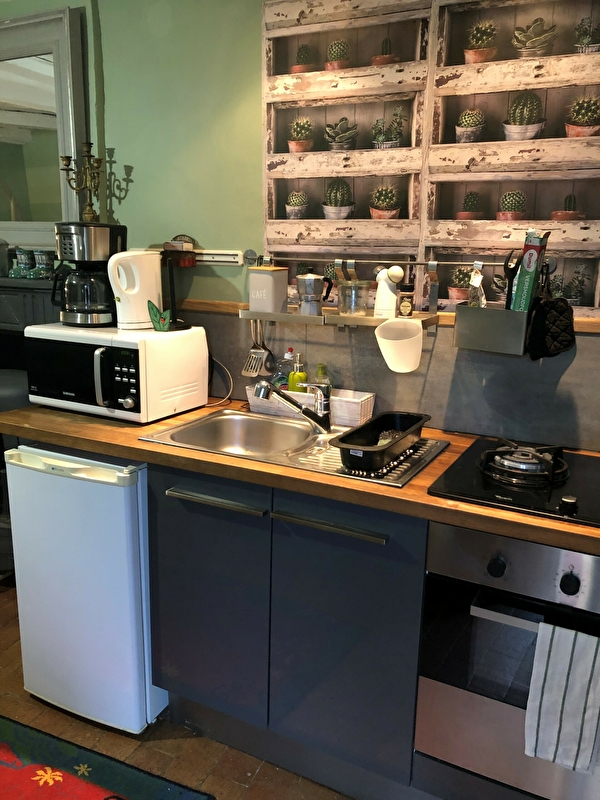 Le gîte est situé dans une cour fermée avec un coin détente (salon de jardin à votre disposition). Quelques marches donnent accès à une pièce à vivre avec un coin cuisine tout équipé et salon avec télévision. A l'étage, chambre et salle d'eau (lavabo et douche). Toilettes indépendantes.