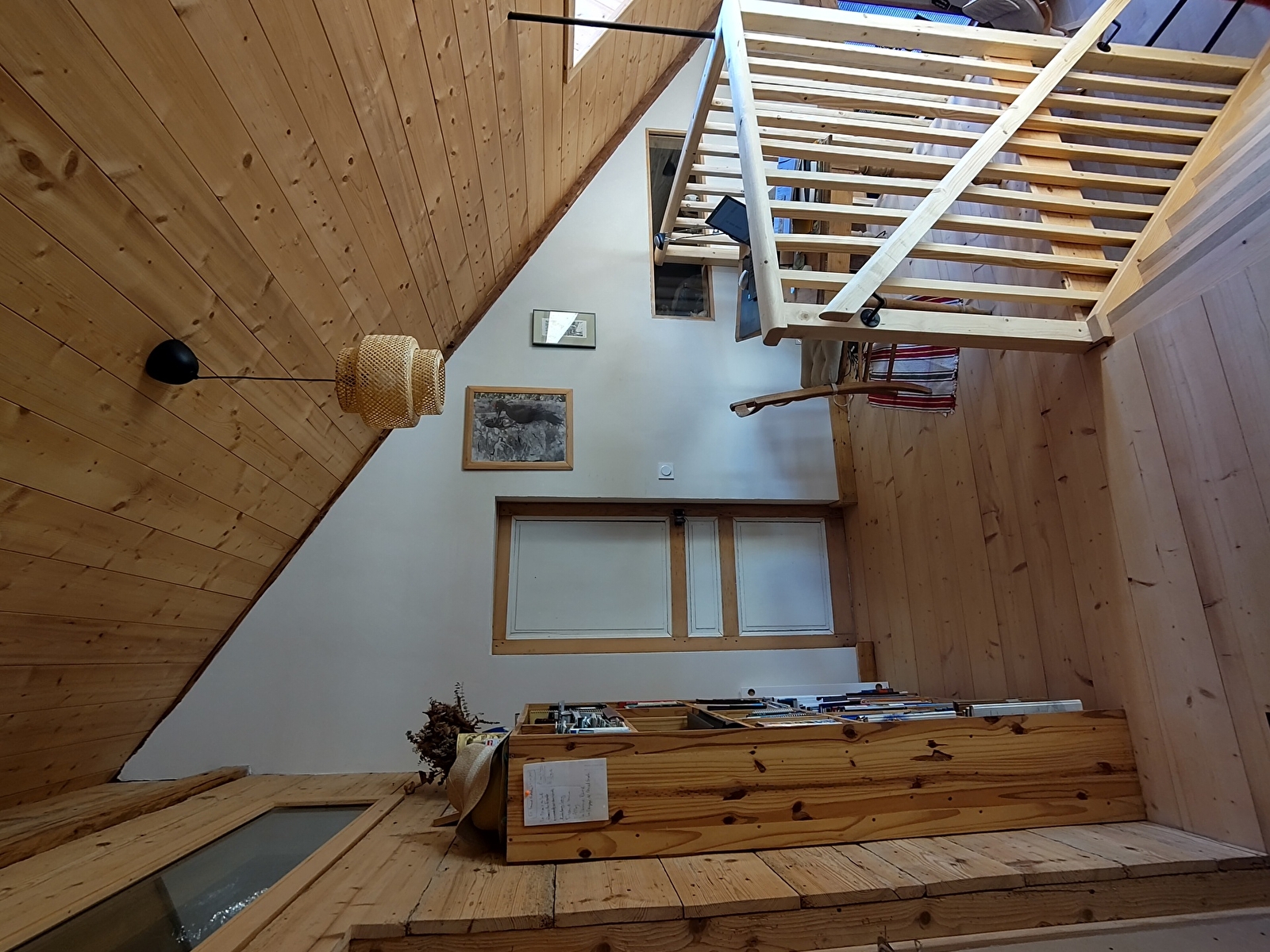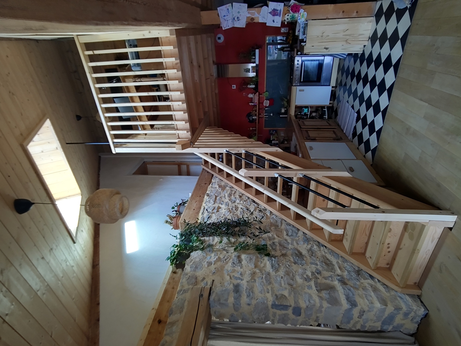 - Au 1er étage : mezzanine, la chambre verte (1 lit double 160x200), la chambre rouge (1 lit 1 place 90x190, 1 clic-clac 130x190).