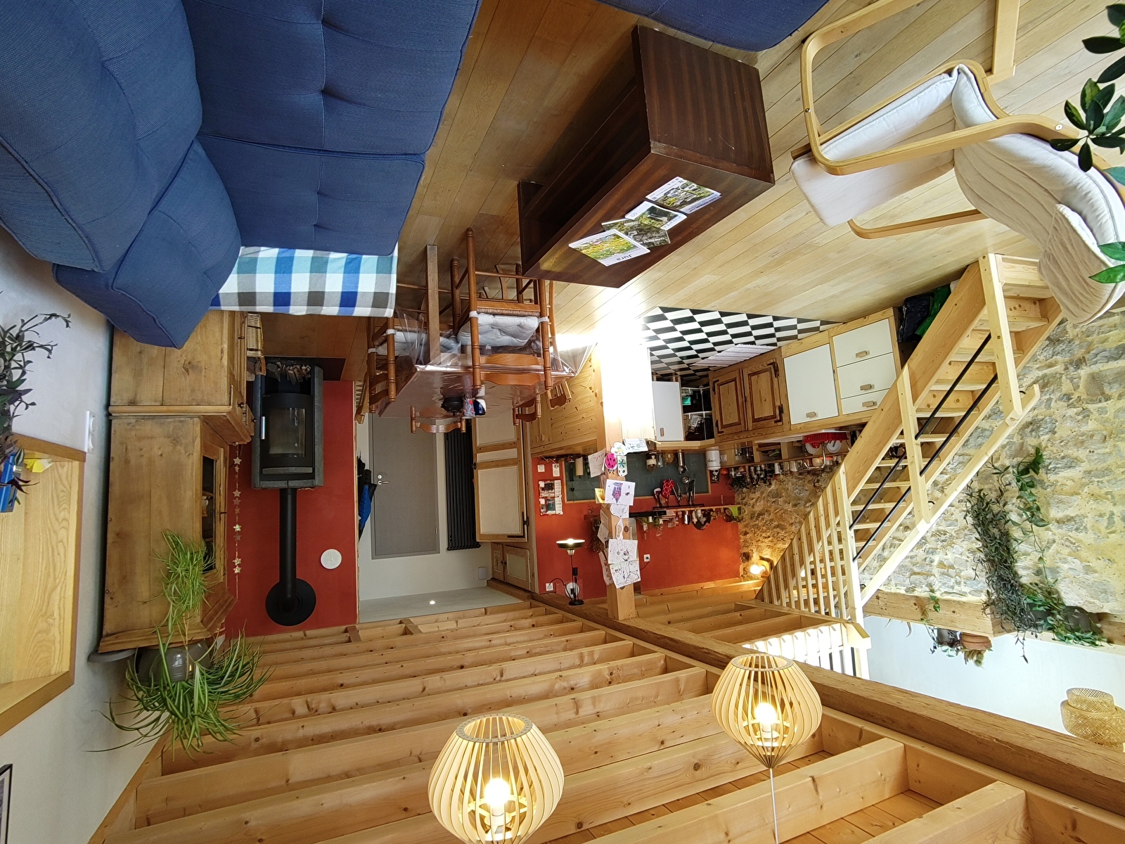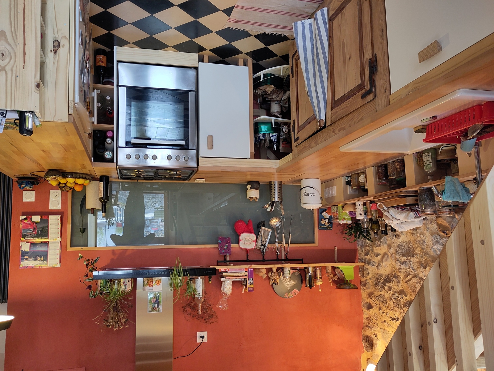 - Au rez de chaussée : une entrée, une grande pièce de vie (cuisine – salle à manger – salon), un salon/chambre avec un lit 2 places (140x190) (pièce fermé avec un rideau), salle de bain (douche, baignoire), WC séparés.